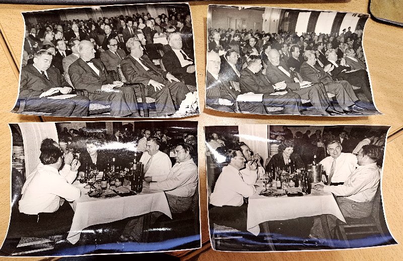 4 schön erhaltene Pressefoto, dürften aus den 50er bzw. 60er Jahren stammen. Leider sind mir die Personen darauf nicht bekannt. Aber aufgrund der Anzüge und der feinen Ausstattung nehme ich mal an, dass es Politiker aus dieser Zeit sind. Auf der Rückseite jeweils ein Bildrechts-Stempel einer bekannten Leipziger Firma.