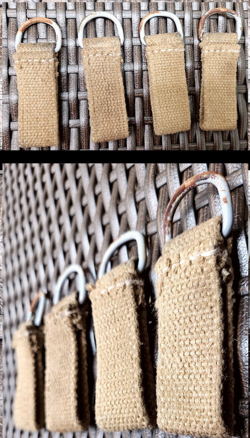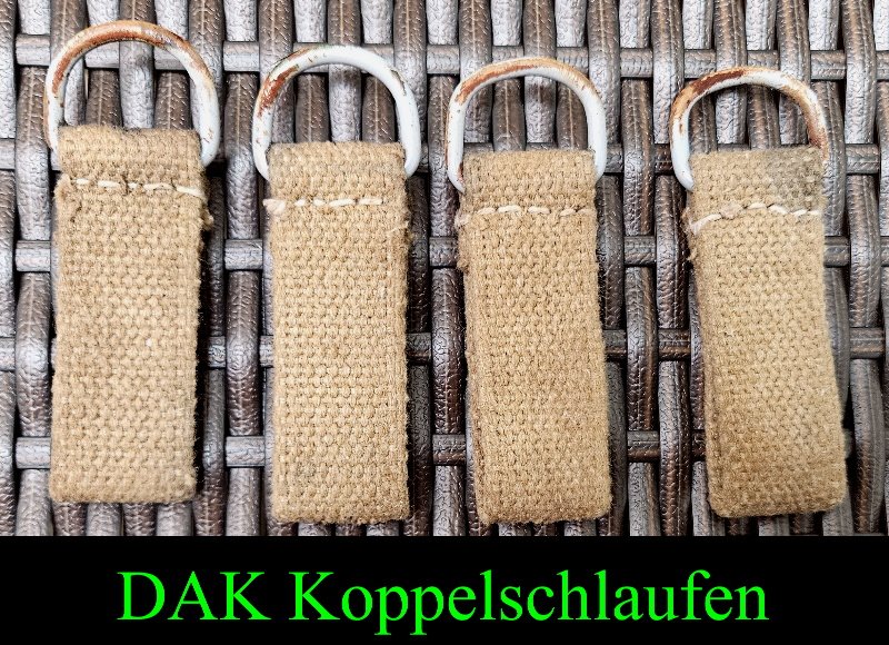 DAK Koppelschlaufen in einwandfreiem Erhatlungszustand; nur Gebrauchsspuren und leichte Verschmutzungen; Nähte halten bombenfest; D-Ringe teils mit originaler Lackierung bzw. teils mit leichten Flugrost; keine Beschädigungen, keine Mottenlöcher
