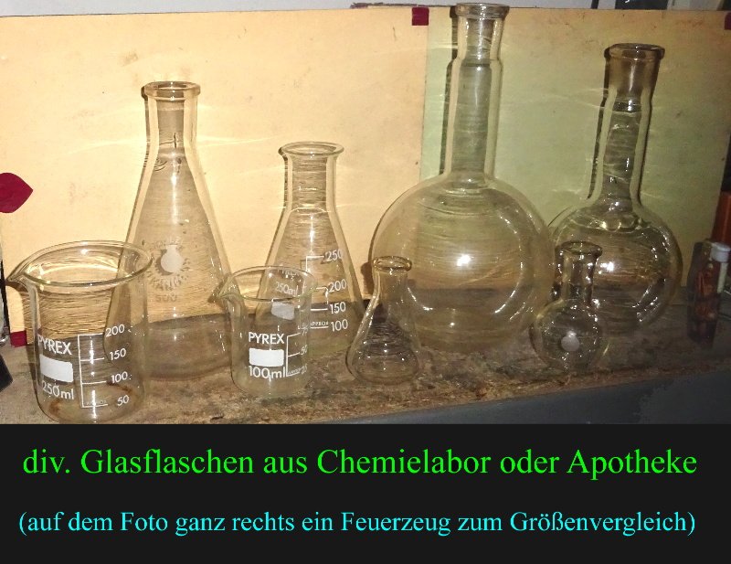 div. Glasflaschen und Glasbecher aus einem Chemie Labor oder einer Apotheke – unterschiedlchste Ausführungen und die Beschriftungen sind auch noch gut zu lesen; natürlich komplett unbeschäidigt – auch keine Risse und keine Sprünge;