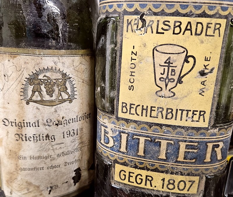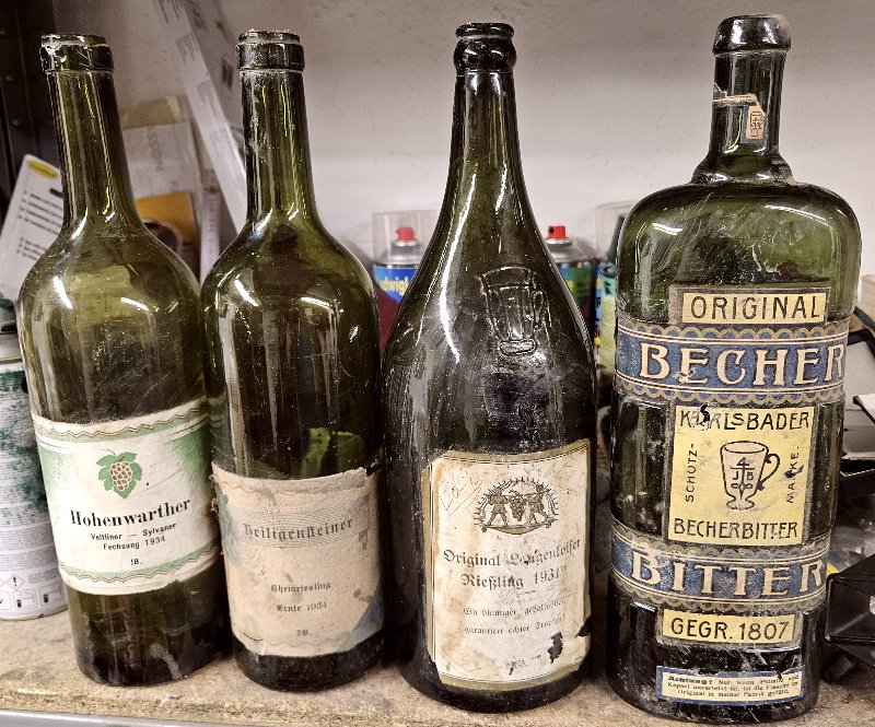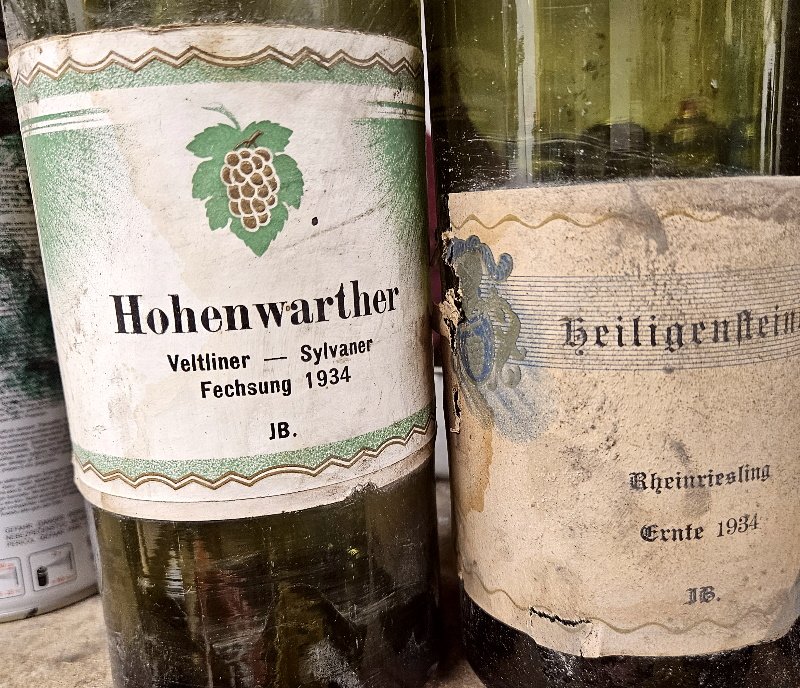 div. Weinflaschem von 1931 und 1934 und somit aus der Reichswehr Zeit! Leider leer, aber dafür mit schön erhaltenem Etikett; Die Weinfalschen befinden sich noch im angestaubten und leicht verschmutzten Fundzustand; Ist aber, wenn man dies möchte, leicht mit einem feuchten Tuch zu reinigen;