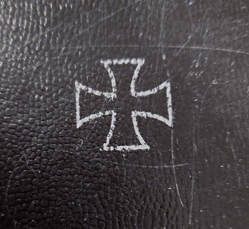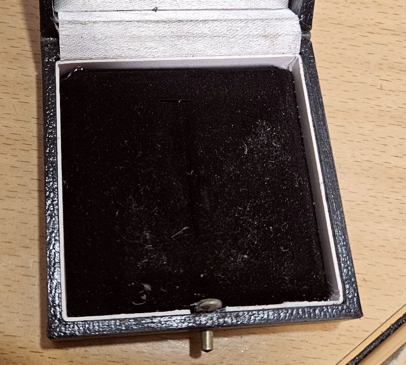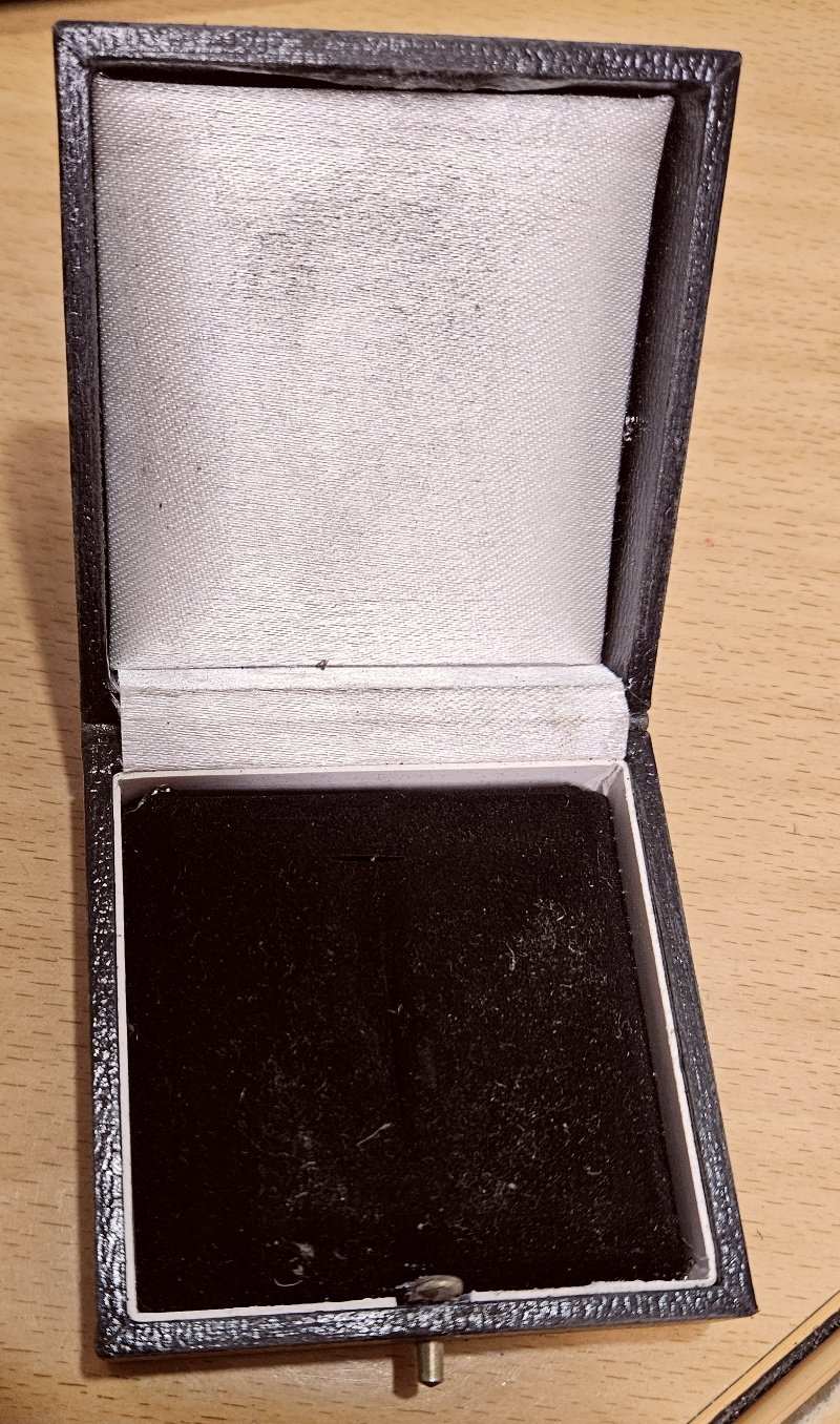 EK1 Ordens Etui im unbeschädigten Zustand; nur Gebrauchsspuren und Verschmutzungen; Produktionszeitraum (WK1, WK2,..??) nicht feststellbar; Scharnier noch leichtgängig, Deckel schließt absolut perfekt und passgenau; keine Beschädigungen; Druckknopf und Verschlussplättchen innen mit Oxidationsspuren – allerdings leicht zu reinigen; das aufgeruckte EK1 am Deckel etwas berieben – aber klar und sauber zu sehen;