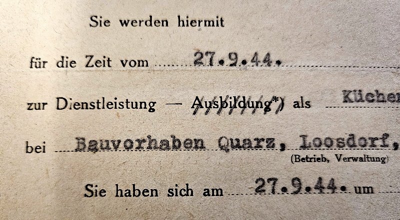Bei dem hier angebotenen Dokument handelt es sich um ein extrem seltenes Dokument in dem eine zivile Person dazu verpflichtet wurde sich bei der Anlage dieses militärischen Geheimprojektes sich zu melden um dort zukünftig als Küchengehilfin zu arbeiten. Und so sind hier auf diesen Dokument auch der militärisch Codename Quarz sowie der Standort der geheimen Anlage angeführt. Und dies obwohl es sich hier um ein militärisches Geheimprojekt handelte. Extrem seltenes Dokument, dass mir in meiner über 40jährigen Sammlertätigkeit nur ein einzige Mal untergekommen ist.
