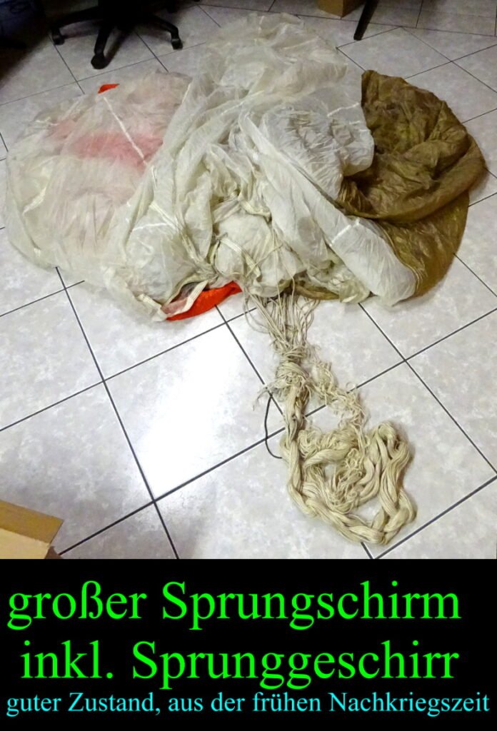 echt selten auf dem freien Markt zu finden da diese militärischen Sprungschirme auch nach dem Ausscheiden nicht verkauft wurden. Und hier können sie noch dazu einen kompletten Sprungschirm ergattern. Also nicht nur den Schirm selbst sondern auch noch das komplette Gurtzeug für den Fallschirmjäger selbst; Und noch dazu ist alles in einem einwandfreien schönen Zustand; also nur Gebrauchsspuren und leichte Verschmutzungen, keine Beschädigungen, keine Mottenlöcher,….alles in einem echt tollen Gesamtzustand;