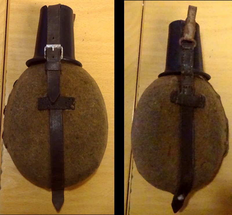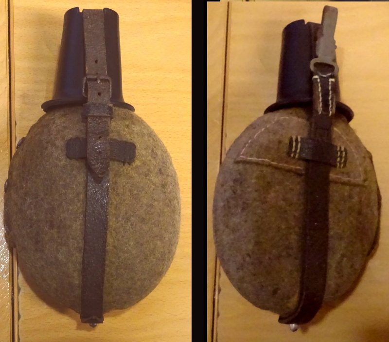 alle Feldflaschen in einem einwandfreien Zustand; keine Beschädigungen, keine Mottenlöcher, Nähte halten alle einwandfrei, keine Dellen in der Feldflasche selbst; Beriemung ebenfalls noch weich und geschmeidig und auch hier sind die Nähte einwandfrei; alle Feldflaschen sind auch noch mit dem Becher dazu und so sind auch alle Feldflaschen vollständig (also ohne fehlenden Teile) erhalten geblieben;