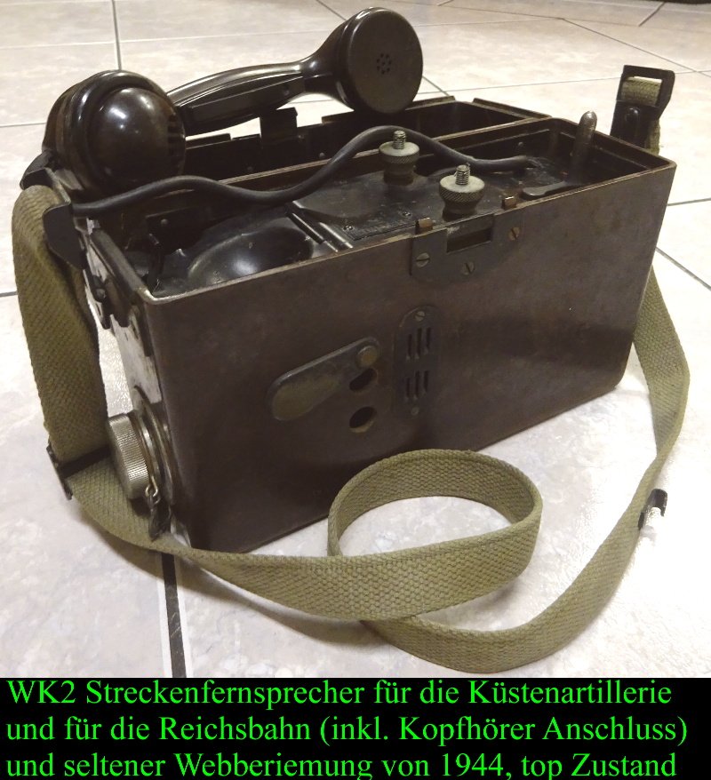 Feldtelefon / Feld Fernsprech Apparat 33 in einer sehr seltenen WK2 Ausführung – konkret der Streckentelefon Ausführung; diese hatte an der Seite einen verschraubten zusätzlich Anschluss und so konnten Feldtelefone mehrfach zusammen verbunden werden; extremst seltene Ausführung da diese nur bei den Stellungen der Küstenartillerie und bei Bahnstrecken zum Einsatz kam; ein weiteres Highlight ist der sehr gute Erhaltungszustand; nur Gebrauchsspuren und leichte Verschmutzungen; keine fehlenden Teile – vollständige Erhaltung; bewegliche Teile alle noch leichtgängig; auch der seitliche verschraubte Anschluss im einwandfreien Zustand und als weiteres Highlight ist auch die Trageberiemung (späte Webausführung von 1944) komplett und gut erhalten geblieben