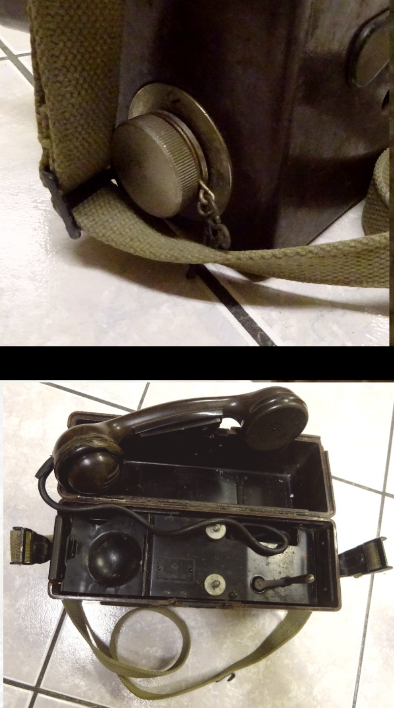 Feldtelefon / Feld Fernsprech Apparat 33 in einer sehr seltenen WK2 Ausführung – konkret der Streckentelefon Ausführung; diese hatte an der Seite einen verschraubten zusätzlich Anschluss und so konnten Feldtelefone mehrfach zusammen verbunden werden; extremst seltene Ausführung da diese nur bei den Stellungen der Küstenartillerie und bei Bahnstrecken zum Einsatz kam; ein weiteres Highlight ist der sehr gute Erhaltungszustand; nur Gebrauchsspuren und leichte Verschmutzungen; keine fehlenden Teile – vollständige Erhaltung; bewegliche Teile alle noch leichtgängig; auch der seitliche verschraubte Anschluss im einwandfreien Zustand und als weiteres Highlight ist auch die Trageberiemung (späte Webausführung von 1944) komplett und gut erhalten geblieben