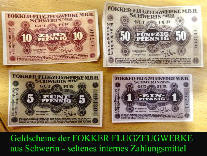 kompletter Satz an Geldscheinen der Fokker Flugzeugwerke aus Schwerin; dienten als internes Zahlungsmittel innerhalb des Werksgeländes (Werksgaststätte, Speisesaal, Tabakladen,…) sowie auch bei den Geschäften (Lebensmittelladen, Bekleidungsgeschäft, Schuhgeschäft,…) die noch zusätzlich von den Fokker Flugzeugwerken in Schwerin betrieben wurden. Hier handelt es sich um einen kompletten Satz an 4 Geldscheinen im guten unbeschädigten Erhaltungszustand; nur Gebrauchsspuren, leichte Verschmutzungen und ev. minimalste Randbeschädigungen; Wurde nur an Mitarbeiter der Fokker Flugzeugwerke ausgegeben und mittels dieser Geldscheine konnten die Mitarbeiter vergünstigt einkaufen
