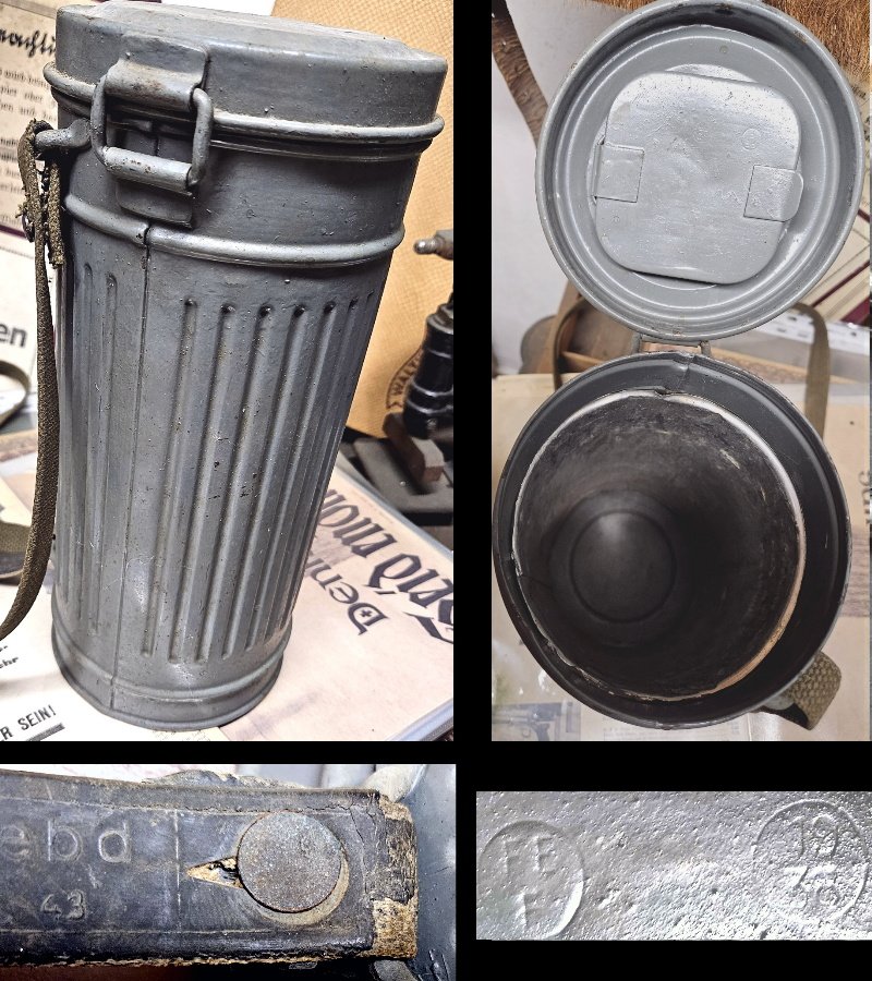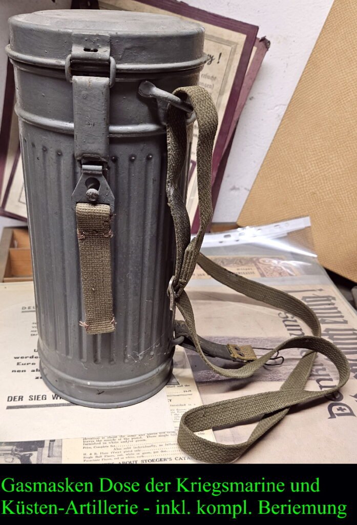 Gasmaskendose inkl. kompletter Beriemung (kurzer + langer Riemen) in seltener Kriegsmarine Ausführung; hat es so offiziell nicht gegeben – aber Soldaten der Kriegsmarine sowie der Küstenartillerie strichen ihre Gasmasken Dosen oftmals in der typischen grauen Kriegsmarine Farbe und sind heutzutage gesuchte Sammlerstück!