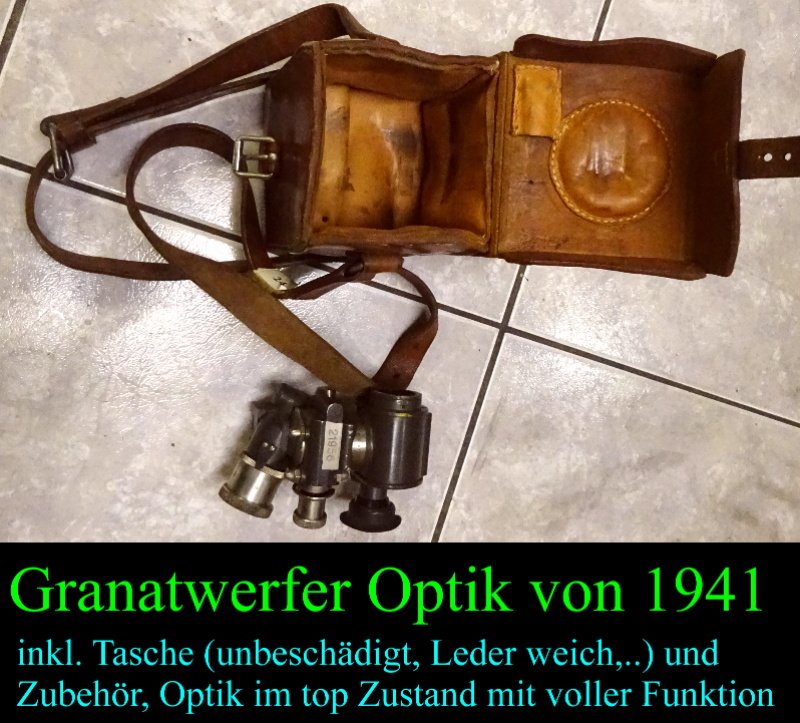 Hier allerdings mal ein echt schönes Stück; gut erhaltene und auch noch voll funkftionsfähige Geschütz Optik von 1941; saubere Durchsicht und auch noch alles leichtgängig; und ebenfalls dabei ist noch die Tragetasche aus Leder; die Nähte sind hier alle einwandfrei; keine Beschädigungen, nur Gebrauchsspuren und Verschmutzungen