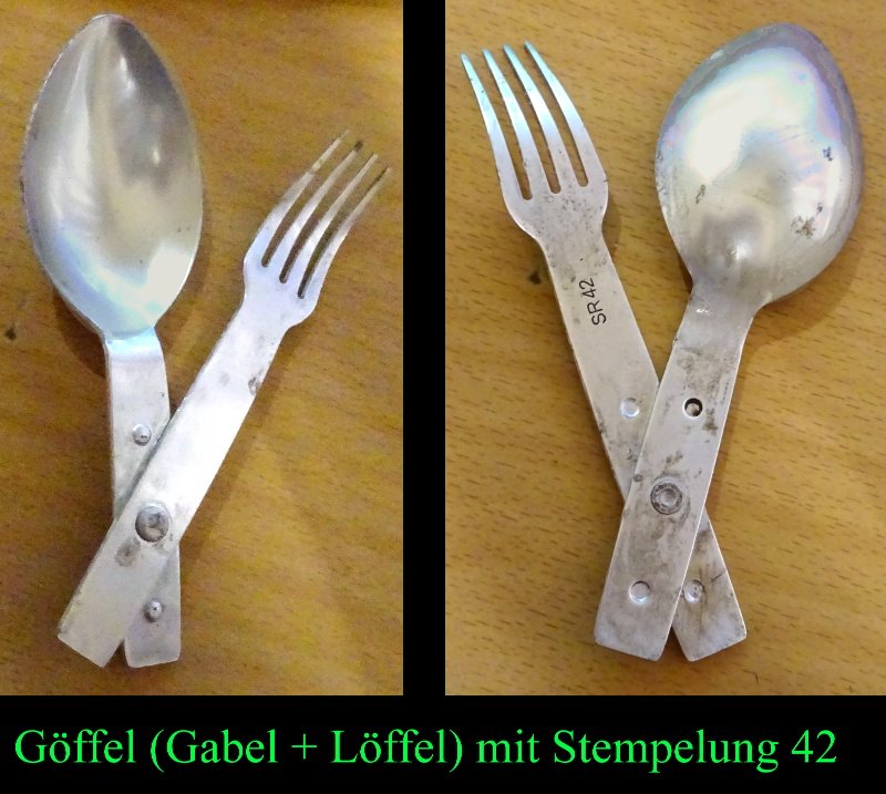 sogenannter Göffel – Essbesteck, dass seinerzeit jeder Soldat erhalten hat; gefertigt aus Alu; leichte Gebrauchsspuren und Verschmutzungen; Herstellerstempelung vorhanden, unbeschädigt