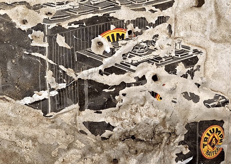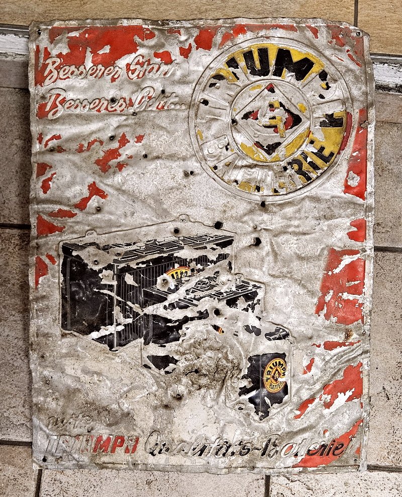 großes Blechschild / Werbeschild der TRIUMPF BATTERIENWERKE aus den 20er / 30er Jahren