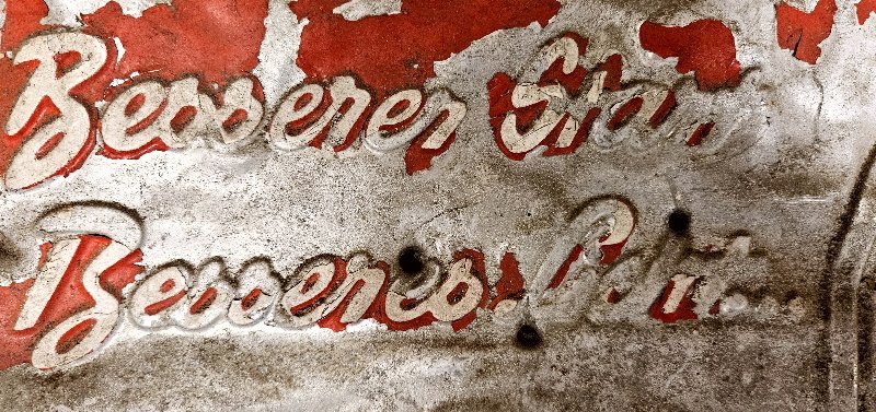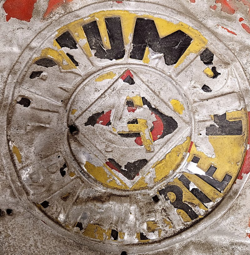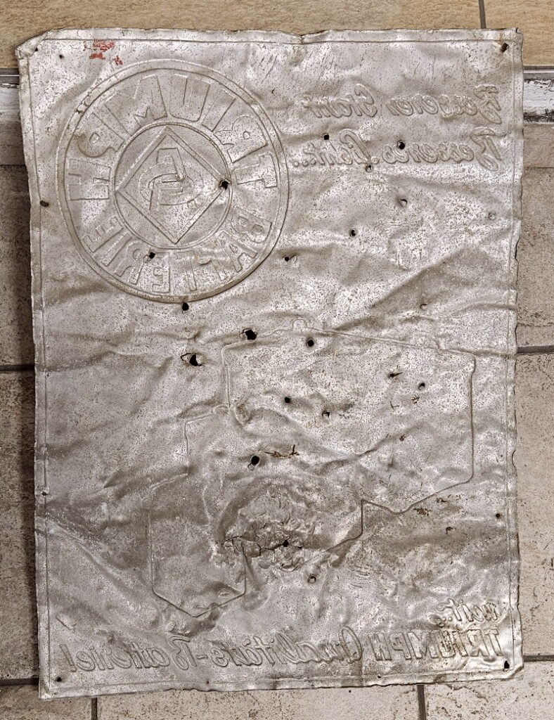 absolut unberührt und original; also wurde nicht einmal gereinigt und ist sonst nie in Sammlerhände gewesen. Somit mehr oder weniger ein jungfräuliches Schild, dass sich durch Reinigung bzw. etwas ausbiegen / begradigen wieder zu einem tollen Schild verwendeln lässt. Gefertigt aus Aluminium und somit auch wieder leicht zu richten; Die Größe des Schildes liegt bei rund 40 x 60 cm