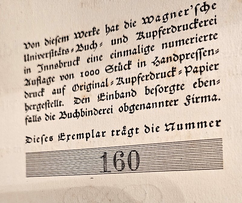 Und so sind in diesem Buch nun mehr als 230 dieser seltenen Abzüge von den originalen Kupferplatten; Das Buch bzw. die Abzüge haben jeweils ein Maß von 25 x 35 cm und befinden sich alle in einem bestechend schönen Zustand; ganz hinten ist auch noch ein Infoblatt wo dies nochmals genau beschrieben ist. Hier ist auch angeführt, dass die seinerzeit hergestellt Stückzahl mit 1000 Stück beschränkt wurde;