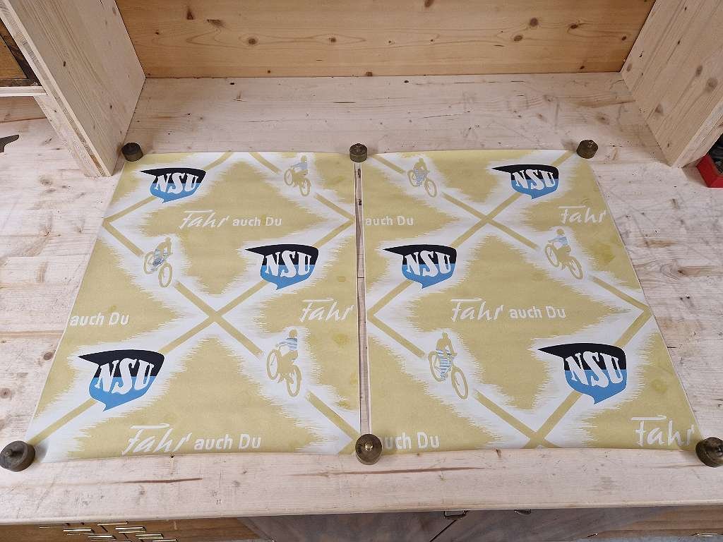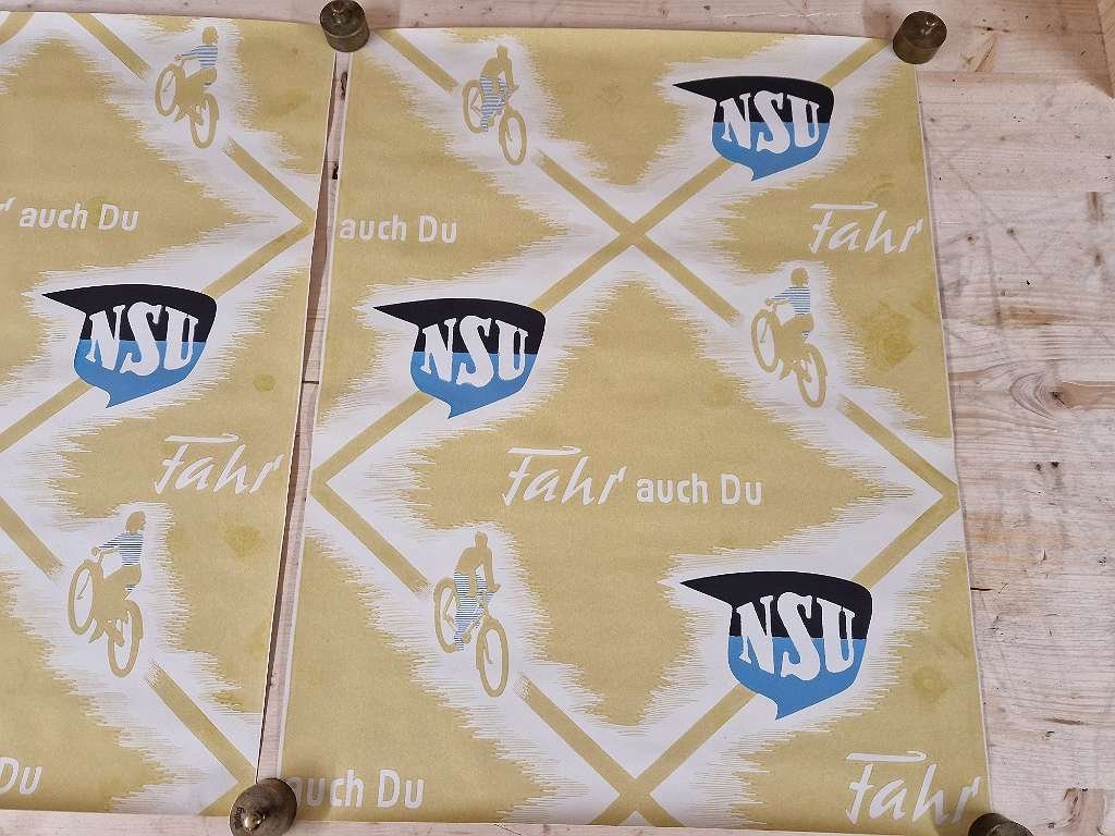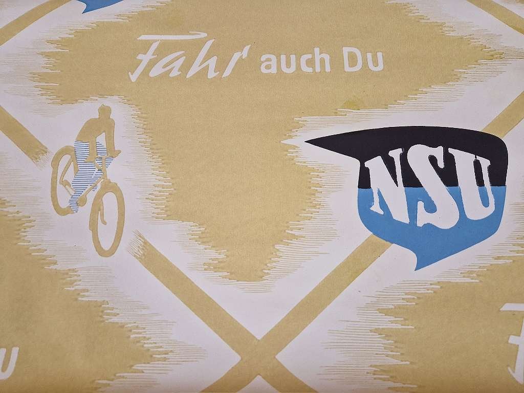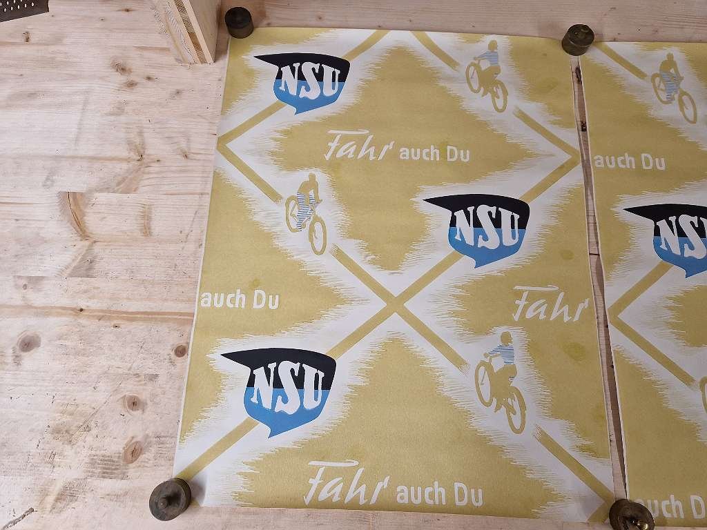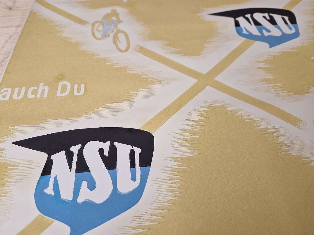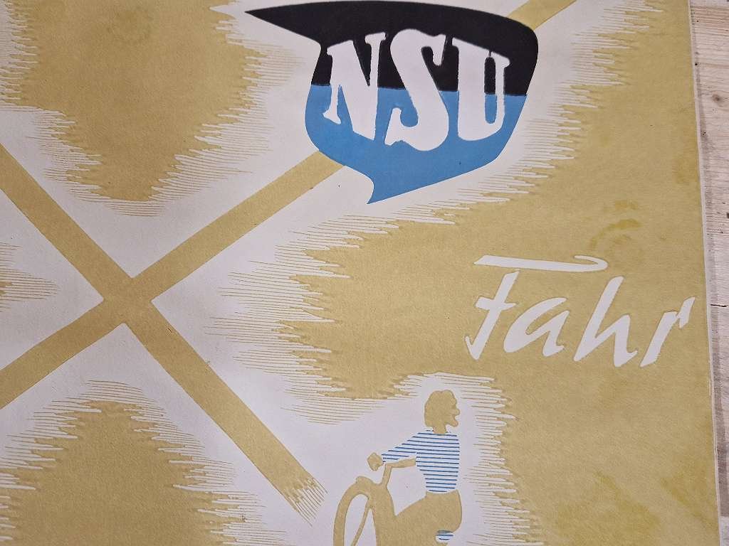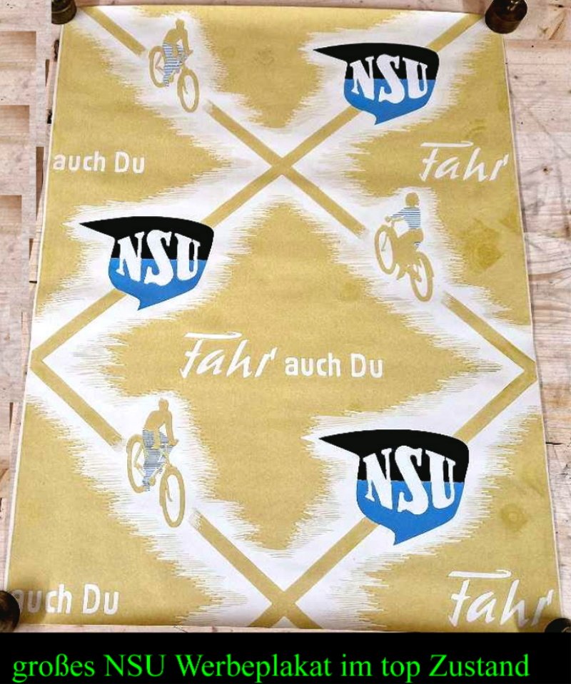 in diesem Zusand nirgends mehr zu bekommen. Großes NSU Fahrrad Plakat aus der Zeit um 1920; durch die gerollte Lagerung sind diese Plakate immer im top Zustand erhalten geblieben; sehr farbenfrisch, keine Beschädigungen,… diese NSU Werbeplakate haben rund ein Vormat von 60 x 85 cm