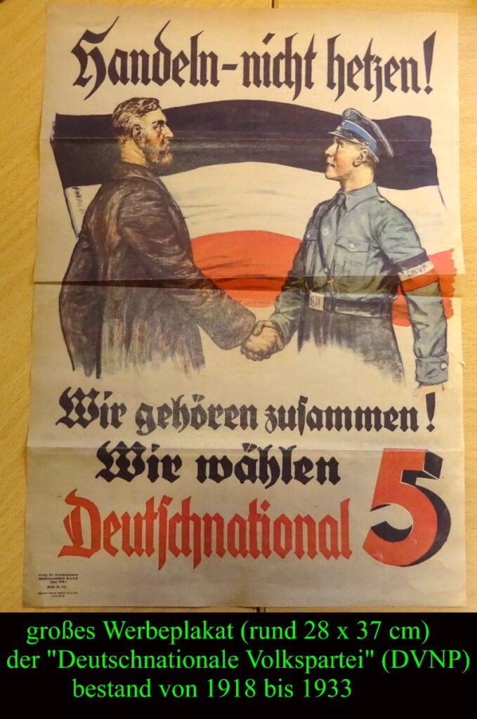 großes politisches Plakat der DEUTSCHNATIONALEN VOLKSPARTEI (DVNP) – “HANDELN – NICHT HETZEN!”