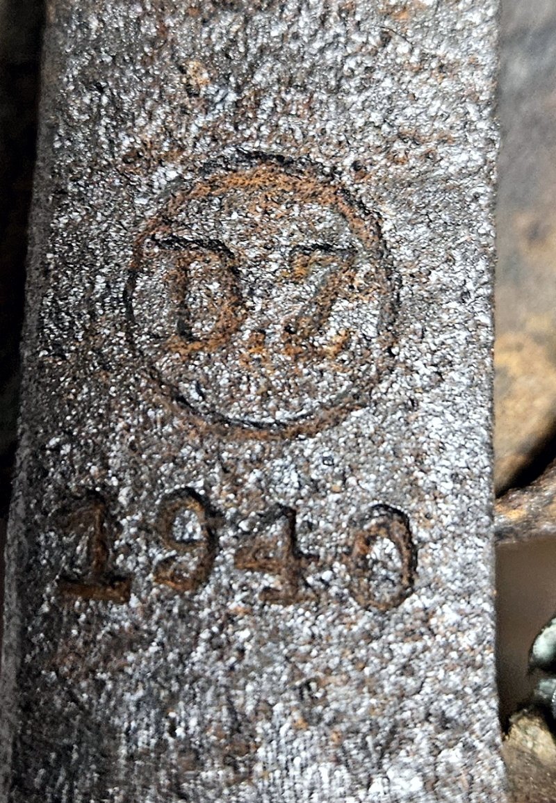 ungereinigter Scheunenfund; das Griffholz ist vergangen – aber leicht wieder zu ersetzen; unberührter Fundzustand, somit ideal zum Restaurieren oder als Ersatzteilspender; Herstellerstempelung und Datierung sind klar zu sehen
