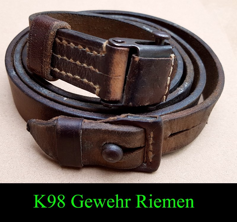 K98 Riemen mit Frosch in guter Erhaltung; nur Gebrauchsspuren und leichte Verschmutzungen, Leder weich und die Nähte halten noch bombenfest, keine Beschädigungen, Metallteile teils mit leichten Flugrost