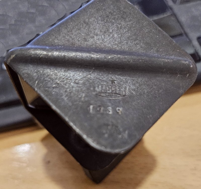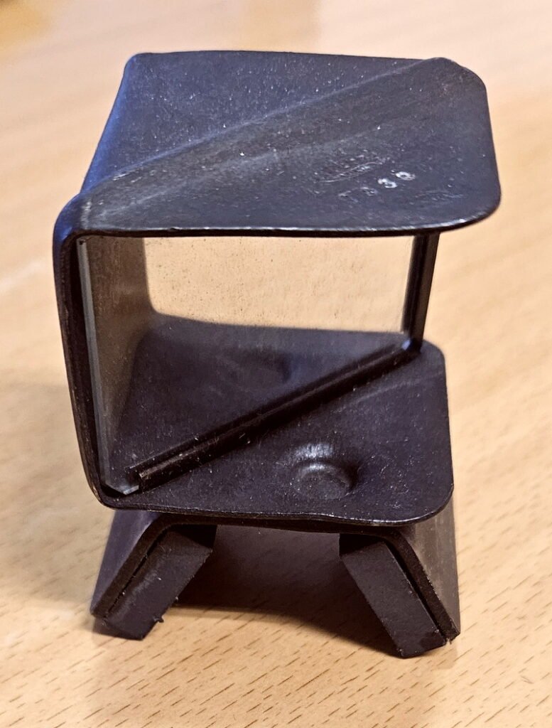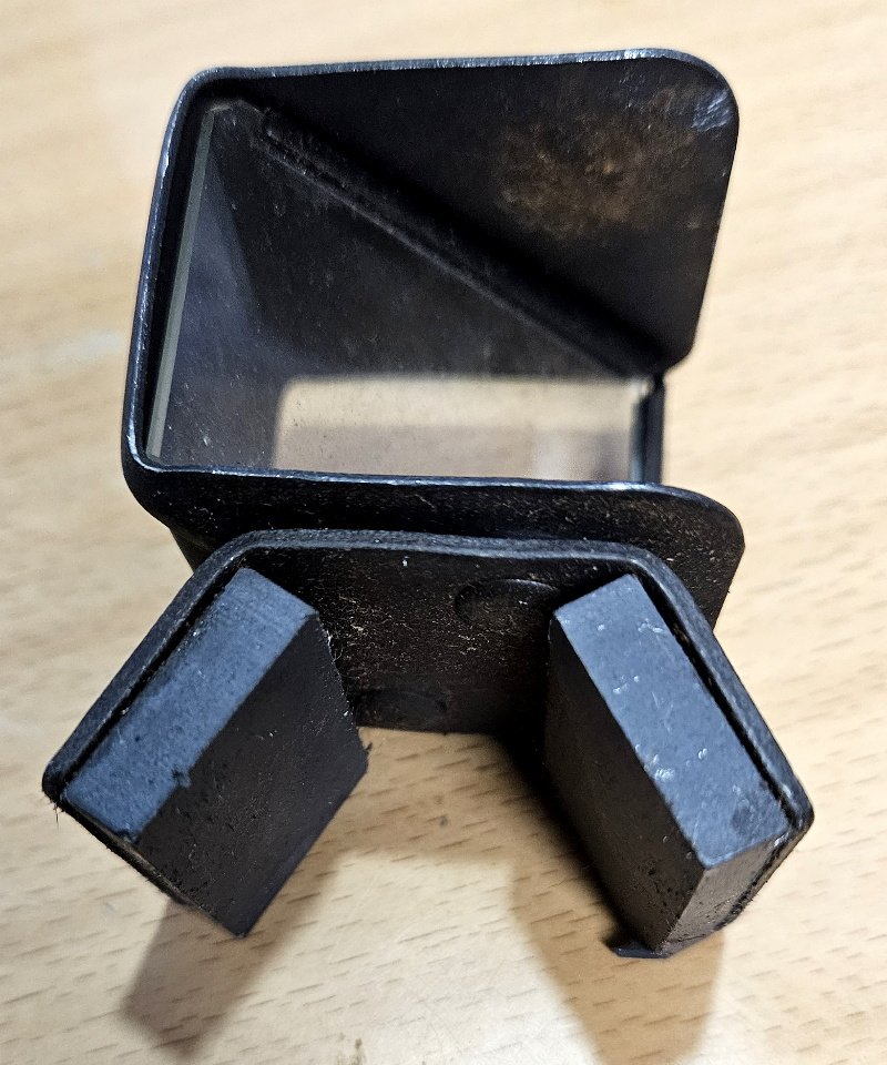 seltenes Stück von den Mauser Waffenwerken. Konkret handelt es sich hier um einen Zielkontroll Spiegel eines Waffenmeisters. Dieser wurde auf den Lauf aufgesetzt und hielt mittels Magneten am Lauf. Die Funktion war relativ einfach – es ist hier eine Glassplatte schräg eingesetzt. So konnte der Schutze einfach durchs Glas hindurch anvisieren. Sah man schräg in die Glasplatte wurde ein Spiegeleffekt durch die Glasplatte erzeugt und so konnte der Waffenmeister ebenfalls kontrollieren ob ein Schütze korrekt zielte. So wurde sicher gestellt, dass das Gewehr korrekt justiert ist und zugleich der Schütze keine Zielfehler machte.