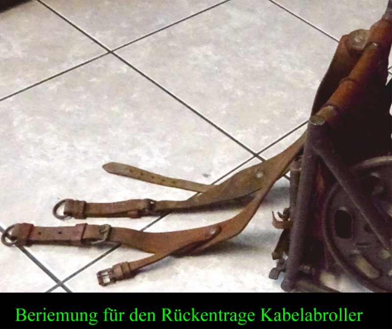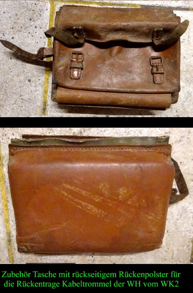 Wie schon erwähnt handelt es sich um die komplette Trageberiemung (wurde am Rücken getragen) für den Kabelabroller der Nachrichten Einheiten; Ebenfalls die kleine Zubehörtasche die zugleich an der Rückseite als Rückenpolsterung ausgeführt ist;