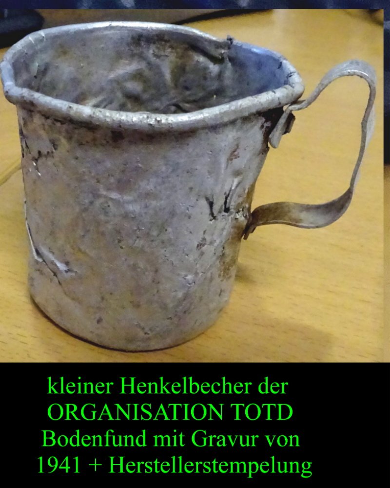 gefertigt aus Aluminium; Ausführung mit Henkel um sich nicht gleich die Finger zu verbrennen; an der Unterseite eine tolle Gravur durch den Soldaten mit den typischen OT Kürzel der Einheit sowie der Datierung 1941; ebenfalls ist die Herstellerstempelung vorhanden und noch gut zu erkennen