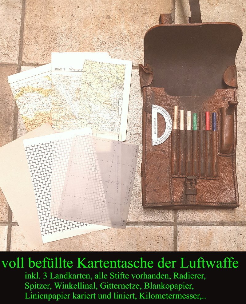 Ein absoluter Hammer und eine ausgesprochene Seltenheit ist allerdings der vollständige Inhalt. Dieser besteht aus 2 Gitternetzen von 1939 (wurde auf die Landkarte aufgelegt um darauf zu zeichnen und dabei nicht die Landkarte selbst zu bemalen); Linienpapier sowie Gitterpapier, Zetteln blanko für Nachrichten, 2 Landkarten mit dem Aufdruck “NUR FÜR DEN DIENSTGEBRAUCH”; Lineal, div. farbig unterschiedliche Stifte sowie auch ncoh ein Bleistiftspiter dazu, Radiergummi – alles in allem ein echt umfangreiches und komplettes Konvolut aus dem WK2