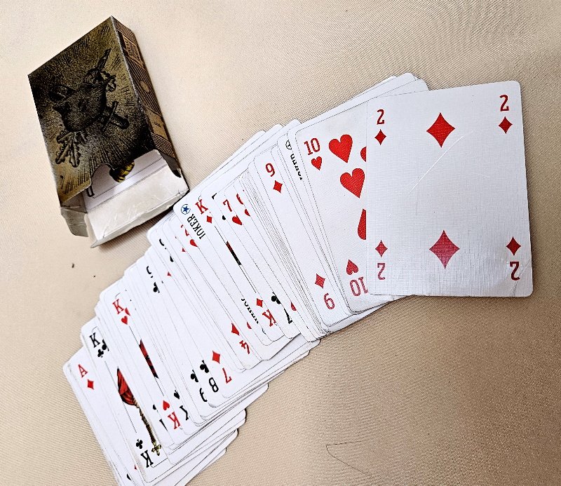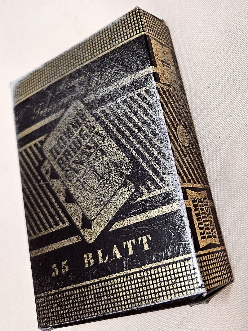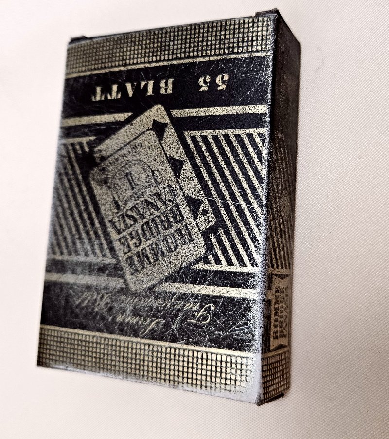 Und so sind hier diese Karten sehr rein und schön erhalten geblieben; nur geringste Gebrauchsspuren und geringste Verschmutzungen; und das Wesentlichste überhaupt – es sind alle Spielkarten noch vorhanden (somit auch noch die beiden Joker um verschiedenste Kartenspiele spielen zu können); also ein komplettes Set an Spielkarten für Wehrmachts Offiziere aus dem WK2