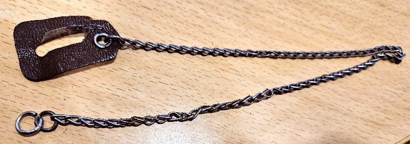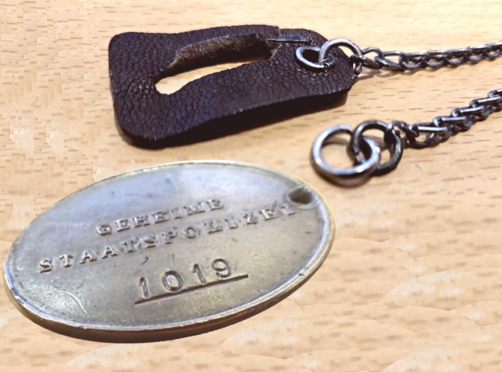 Und diese Kette für die Dienstmarke ist nicht nur extrem selten sondern auch noch gut erhalten geblieben; gerade mal am Leder findet sich eine alte Repartur; Leder ist auch noch weich und geschmeidig und auch die Öse hält noch bombenfest; alles vollständig erhalten geblieben – keine fehlenden Teile; schöne gleichmässige Alterspatina – kein Rost oder dergleichen vorhanden; alles in allem ein noch echt guter Gesamtzustand