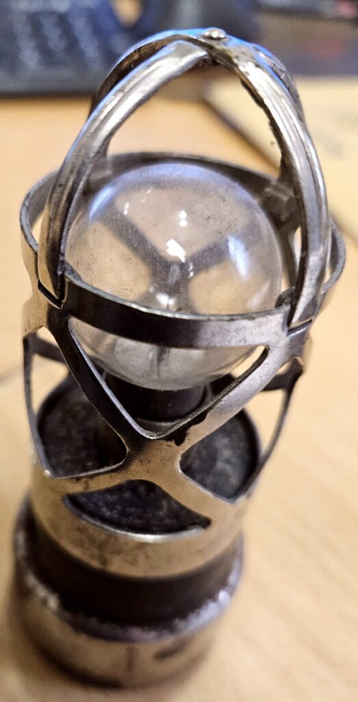 kleine Bosch Lampe für Fahrzeug Reparaturen – mit Magnet zur einfachen Befestigung am Fahrzeug selbst; patentierte Ausführung von Bosch, klein aber fein – rund 10 cm hoch; zusätzlich mit Schutzgitter um die Glühbirne selbst zu schützen; nichts verbogen und nichts verzogen; schöner Gesamtzustand; an der Unterseite leichter Rostansatz aber dieser lässt sich leicht entfernen; die Beschriftung am Boden der Lampe ist ebenfalls einwandfrei zu lesen;