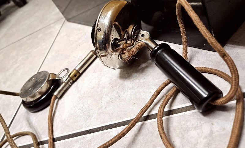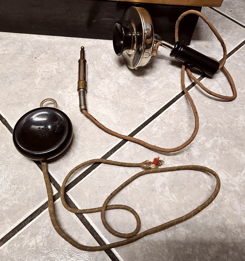 komplette Sprech- und Hörer Garnitur für ein Wandtelefon aus der Zeit um 1900 bis 1920