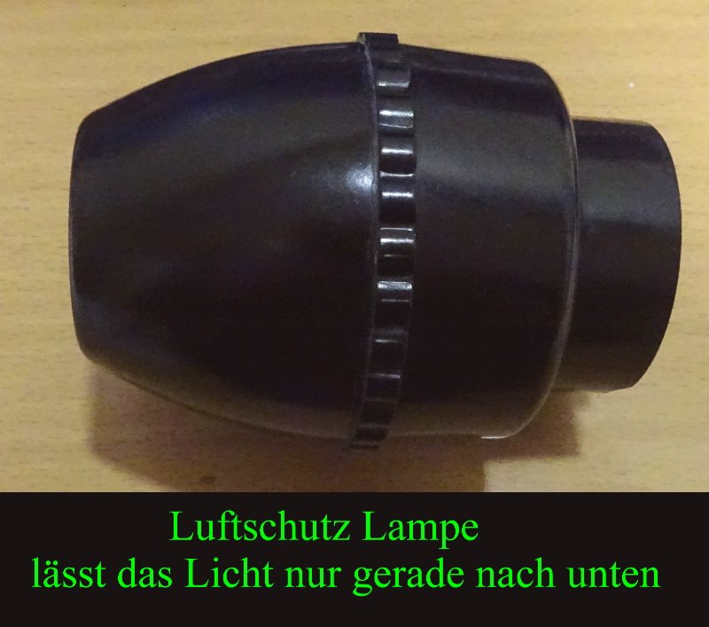 Überfang um aus einem normalen Kellerlicht, dass seinerzeit in der Regel nur aus einer Glühbirne bestand, ein Luftschutz Kellerlicht zu bewerkstelligen; Das Objekt aus Bakelit?? wurde in der Mitte aufgeschraubt und über die Lampenfassung gesteckt, Glühbirne eingeschraubt und der 2. Teil des Überfanges darüber geschraubt; So konnte das Licht nur mehr gebündelt nach unten austreten und verhinderte ein verräterisches Ausleuchten des kompletten Kellers; Nach dem Krieg oftmals weggeworden da hierfür keine Verwendung mehr gegeben war; somit eher selten zu finden und dieses Stück ist noch dazu in einem guten und unbeschädigten Erhaltungszustand