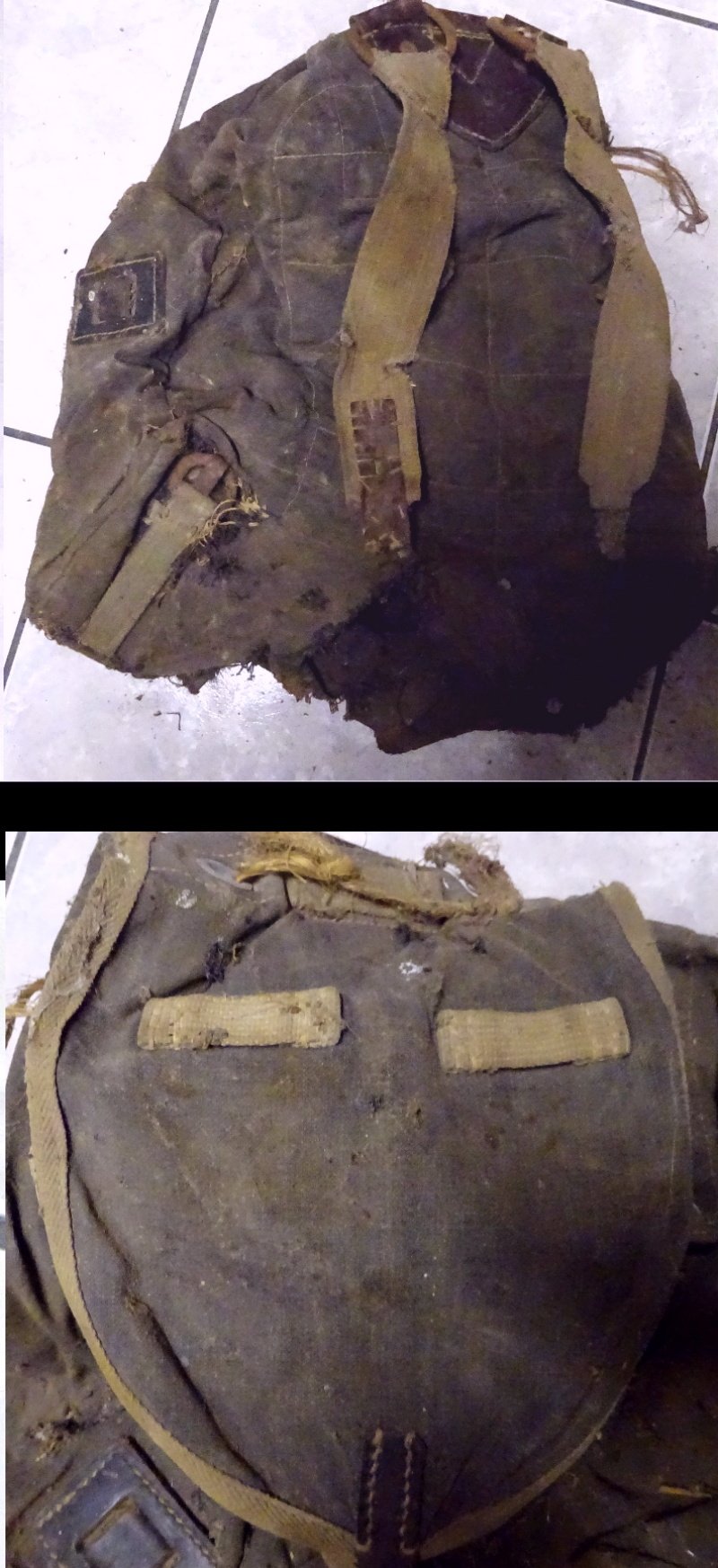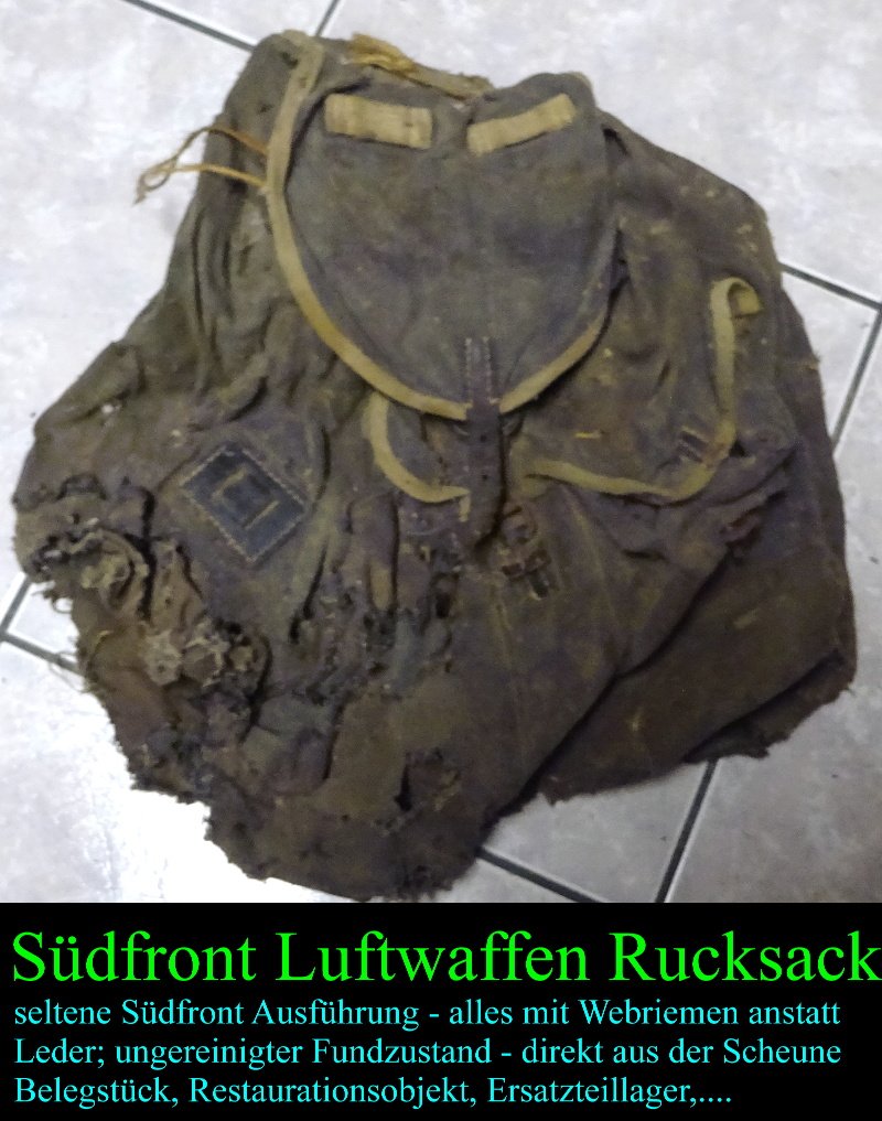 schade um das Teil – mal selbst in einer Scheune aufgefunden. Leider hat auch den Mäusen das Teil gefallen und haben es an der Unterseite mit eingen Löchern versehen; würde sich aber sogar wieder reparieren lassen – oder man verwendet es als Belegstück denn es ist ein Luftwaffenrucksack in der seltenen Südfront Ausführung – oder man könnte es auch noch als Ersatzteilspender verwendet denn es sind ja nur die Löcher an der Unterseite und sonst ist das Stück noch in einem guten Zustand;