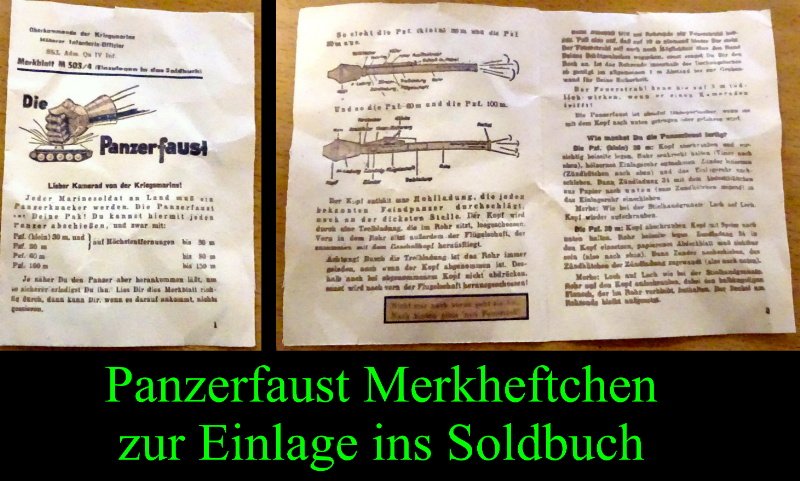 selten zu finden da dies erst gegen Kriegsende an frisch eingezogene Truppen mit dem Soldbuch ausgegeben wurde. War somit im Soldbuch ganz hinten eingelegt und erkläre auf schnelle und einfache Weise die Handhabung zur Panzerfaust bzw. die Mittel zur Panzerbekämpfung. Der Zustand ist noch recht gut; zwar Gebrauchsspuren, etwas zerknittert und verschmutzt – aber vollständig und ohne Beschädigungen; selbstverständlich kein UV Leuchten, allerdings sind die Papierqulität und der Druck bereits der Endkriegsphase geschuldet und somit nicht mehr hochwertig sondern eher minderwertig ausgeführt worden. Nichts desto Trotz selten zu finden