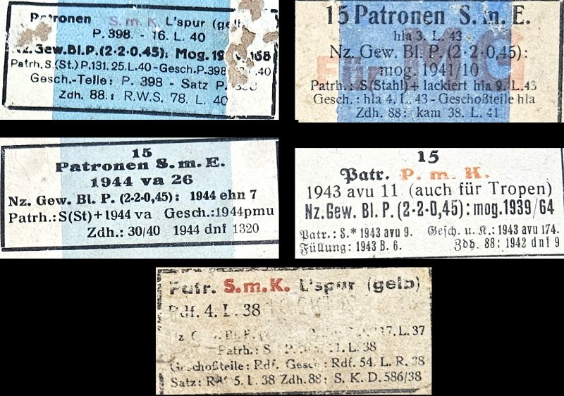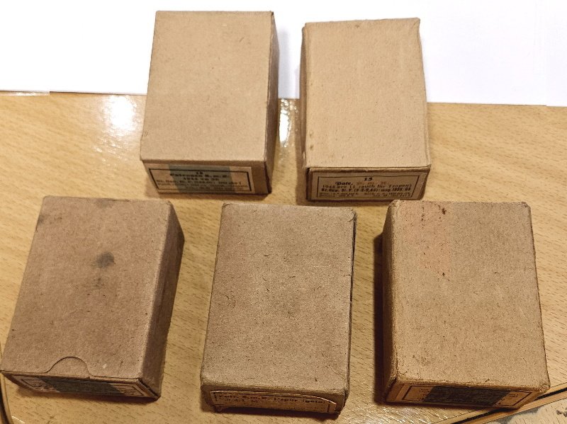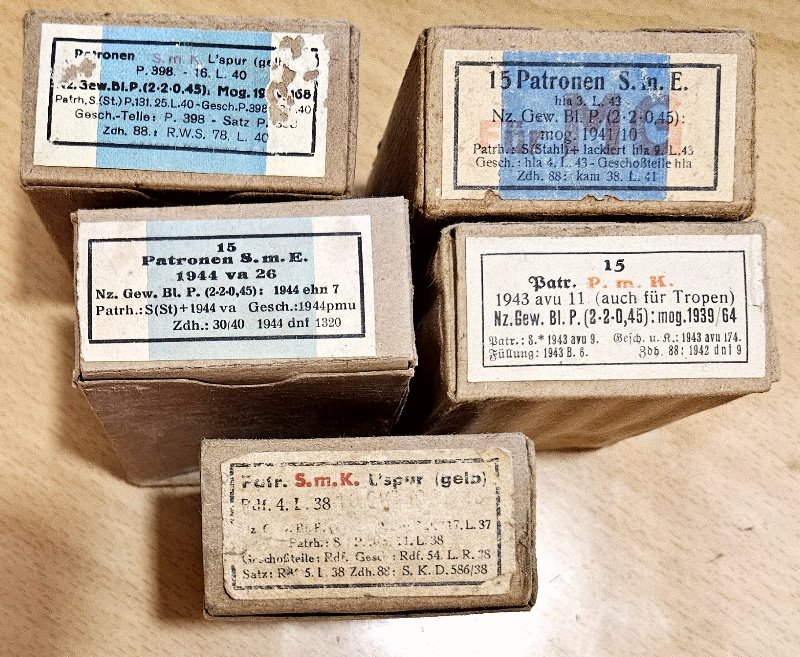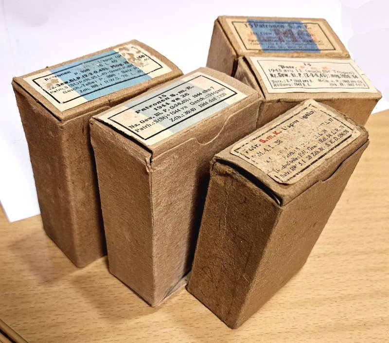 tolles Konvolut an div. Patronen-Schachteln für den K98 bzw. eine ist auch fürs MG42 dabei; hierbei handelt es sich um keine Standart Munitions-Schachteln sondern eher nicht so oft anzutreffende Ausführungen – wie zum Beispiel Leuchtspur Munition, Tropen Munition,…..