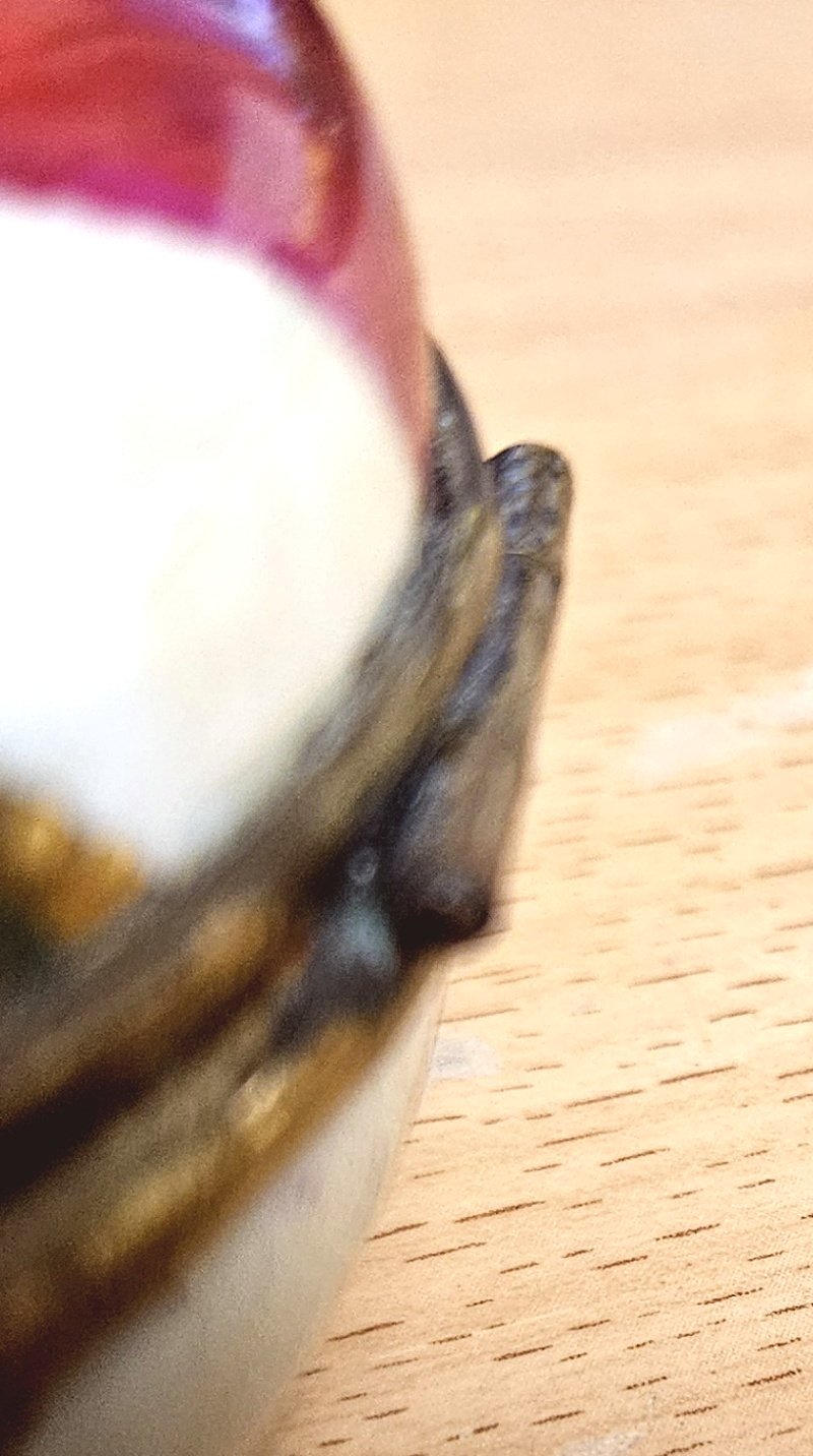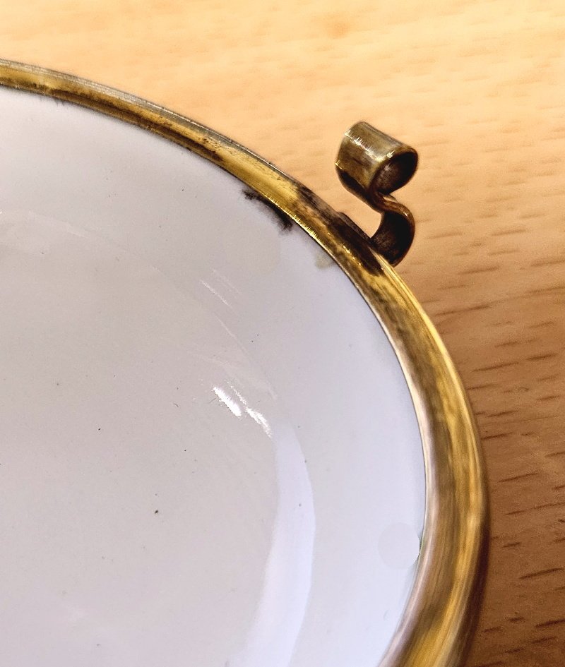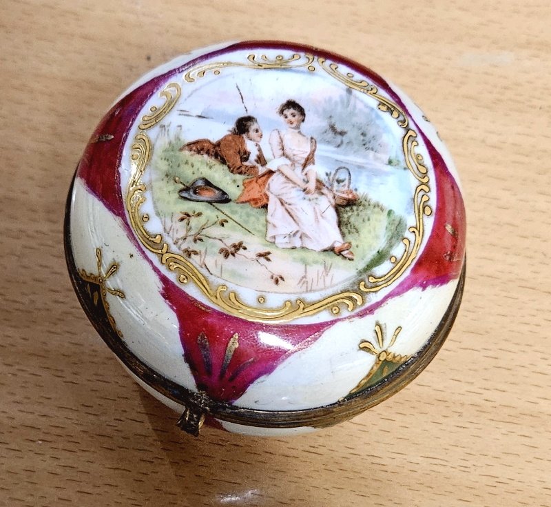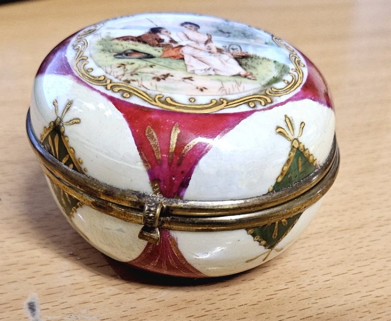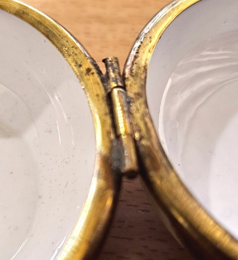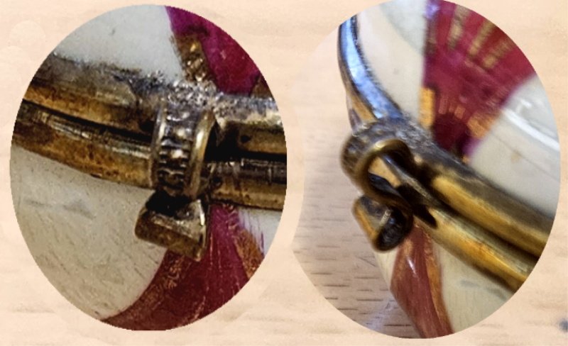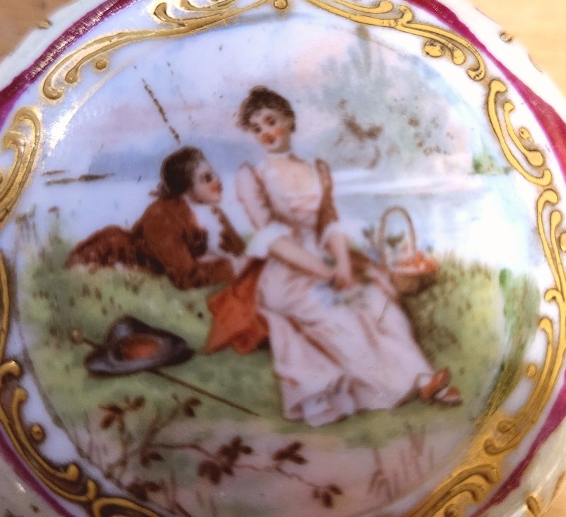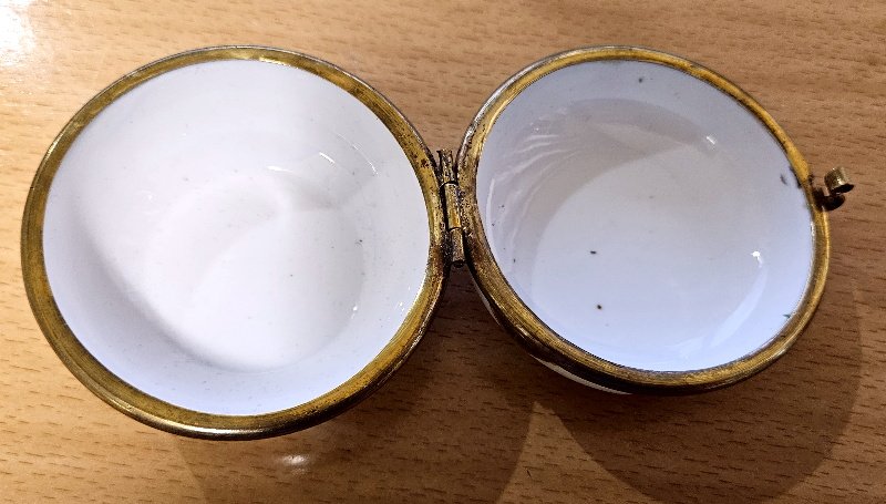 auch das Porzellan komplett unbeschädigt; keine Sprünge, keine Risse, keine Abplatzungen; der Ober- und Unterteil sind mit einer aufwendigen Metallmontierung verbunden und auch hier ist alles top und unbeschädigt erhalten geblieben; Der Durchmesser der Deckeldose lieg bei rund 8 cm;