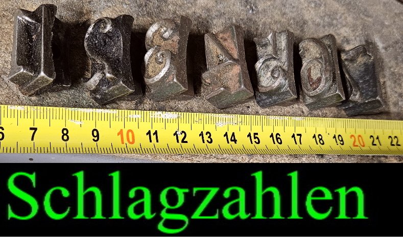 auch nicht mehr alle Tage zu finden; konkret handel es sich hier um einen Satz von 1 bis 7 an Schlagzahlen; konnte somit also ins Leder, in Holzkisten oder auch in Metalle geschlagen werden da es sich hier um eine sehr massive Ausführung handelt; Zugleich befindet sich an der Rückseite ein Fortsatz um die Schlagzahlen in ein Brandeisen einspannen zu können; So konnte diese Ziffern auch in div. Materialien eingebrannt werden.