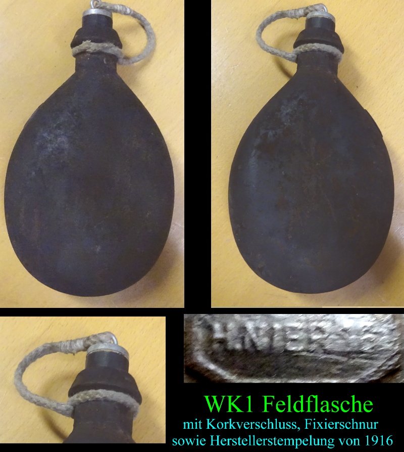auch nicht mehr so oft zu finden; unberührte deutsche WK1 Feldflasche; keine Dellen, keine Beulen, der Verschluss und die Beriemung dazu sind ebenfalls noch erhalten geblieben; alles in allem ein echt schönes Stück Zeitgeschichte