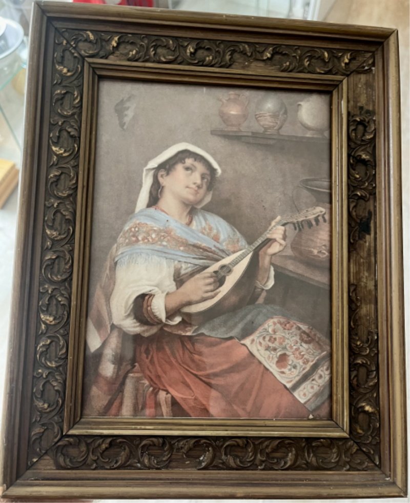 schönes kleines Gemälde aus der Zeit um 1900 – dürfte ein Aquarell oder eine andere Technik sein; jedenfalls sehr feine und saubere Arbeit; Auch der Rahmen ist noch absolut stabil und selbstverständlich frei von Holzwürmern und dergleichen; Der Titel lautet hier auf “Die Lautenspielerin”