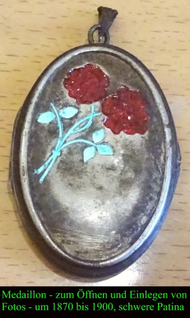 echt ein schönes Medaillon aus der Zeit um 1870 bis rund 1890; guter Gesamtzustand; also nur Gebrauchsspuren und Verschmutzungen; ev. aus Silber gearbeitet; auf dem Deckel verschiedene farbige Auflagen; schöne gleichmässige Alterspatian; das Medaillon schließt auch noch absolut einwandfrei und dienste seinerzeit um Aufbewahren eines kleinen Fotos vom Liebsten.