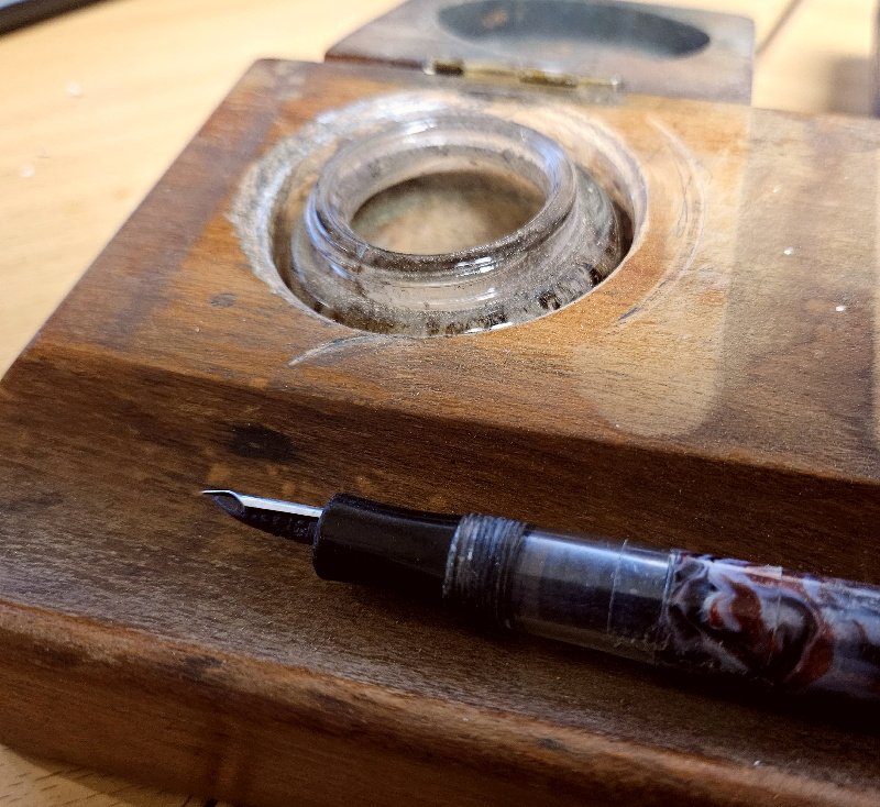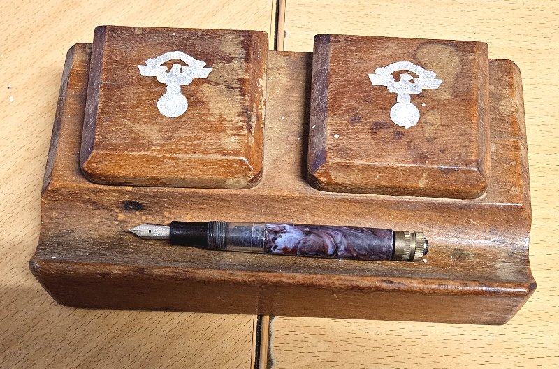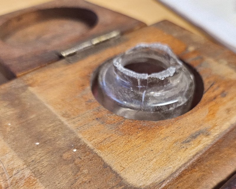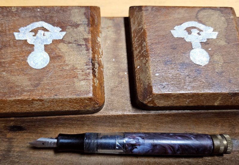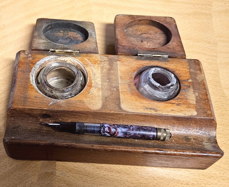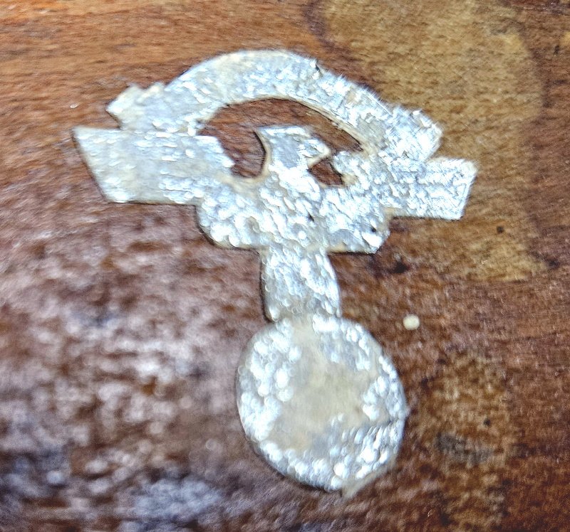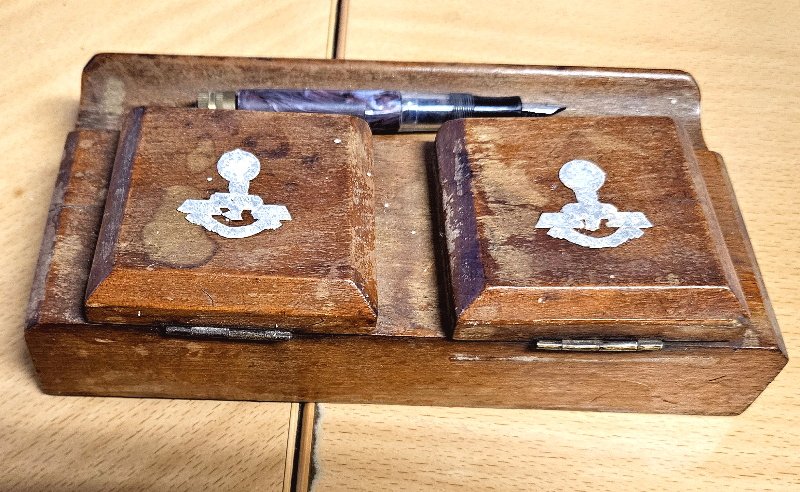 seltenes Stück Zeitgeschiche – komplette Schreibgarnitur des NSKK (Nationalsoz. Kraftfahrer Korbs) eines Offiziers aus dem WK2; ebenfalls ist noch der Tintenschreiber dabei; Das Holz hat keine Sprünge und keine Risse, Deckel leichtgängig und schließen einwandfrei, beide Glaseinsätze ebenfalls dabei; auf den Deckeln jeweils ein aufgelegter dünner Alu Adler des NSKK (wie bei all meinen Gegenständen sind keine verborenen Sybole mehr sichtbar – in diesen Fall durch den Gebrauch sind die verbotenen Symbole komplett vergangen); der Schriftzug NSKK ist noch gut zu lesen; die beiden Auflagen halten auch noch einwandfrei; Momentan noch etwas verschmutzt da noch im Fundzustand; dabei ist auch noch der Tintenschreiber bzw. wurde dieses komplette Set so aufgefunden und ist seit dem komplett unberührt geblieben
