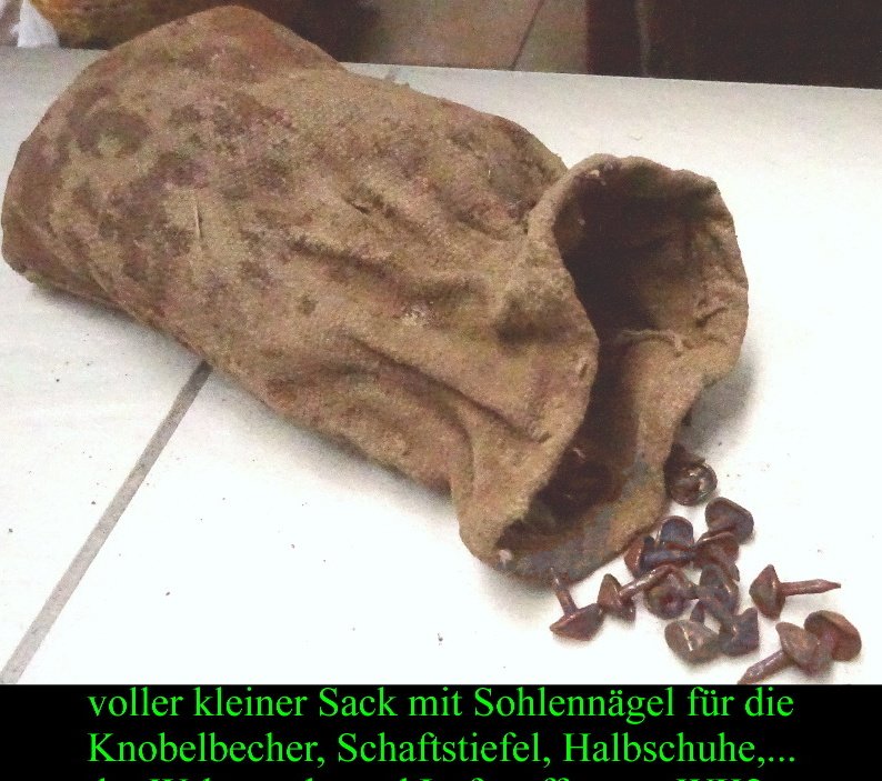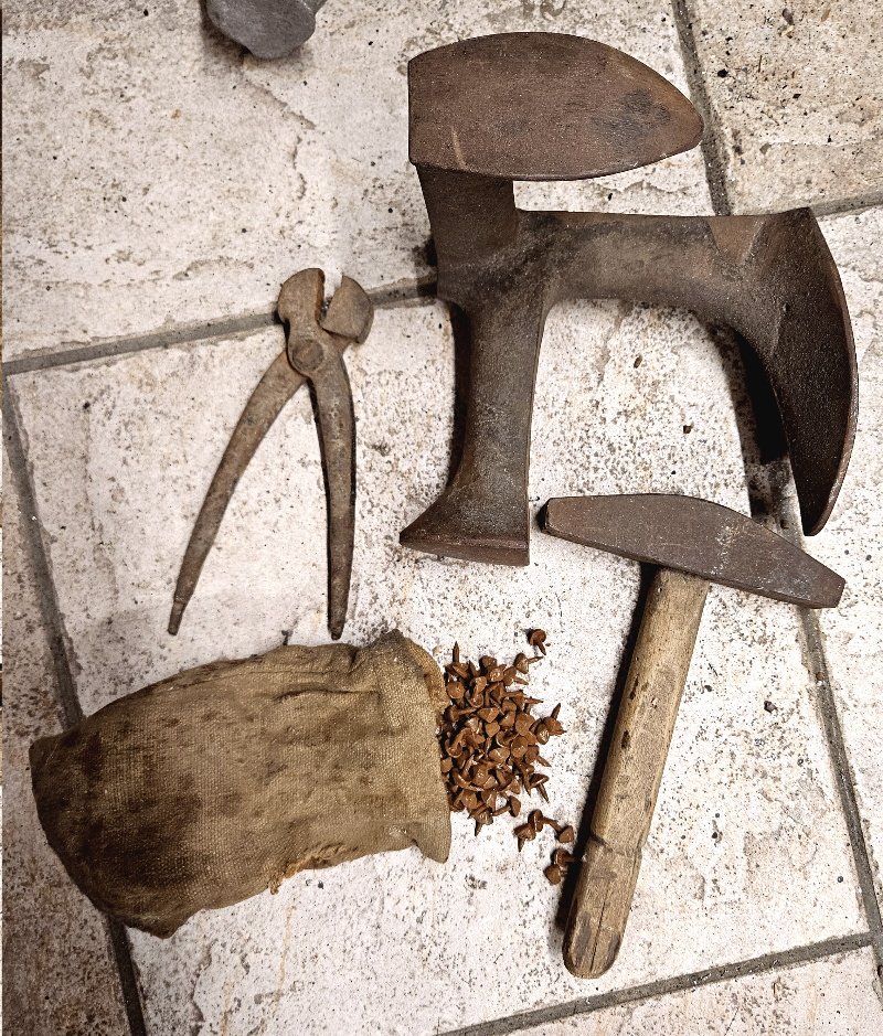 Beim Schusterbock ist auch der Werkzeugsatz dabei; konkret das kleine Schusterkreuz, ein Schusterhammer sowie eine Zange um Sohlennägel ziehen zu können; ebenso noch ein gut befüllter Sack mit Sohlennägel – klassisch in der Ausführung für Knobelbecher