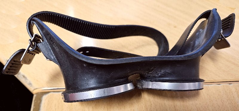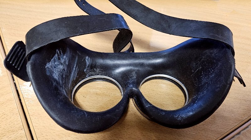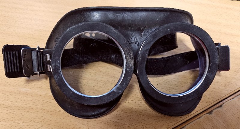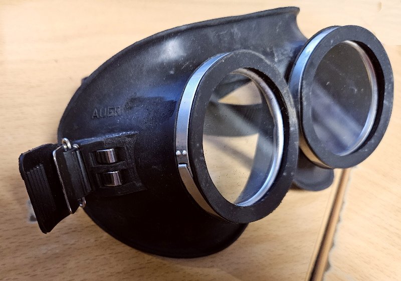 Selten zu finden in diesem guten Gesamtzustand; kaum Gebrauchsspuren und Verschmutzungen; keine Beschädigungen, keine fehlenden Teile; die Schutzbrille war in Ölpapier eingewickelt und so ist auch noch der Gummi elastisch; auch nicht rissig oder dergleichen; die Gläser haben keine Sprünge / keine Risse; Kopfband ist elastisch