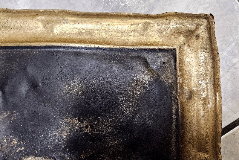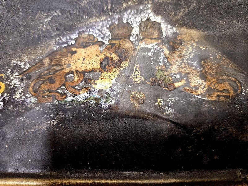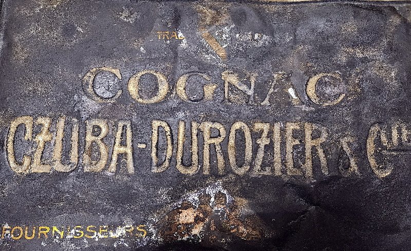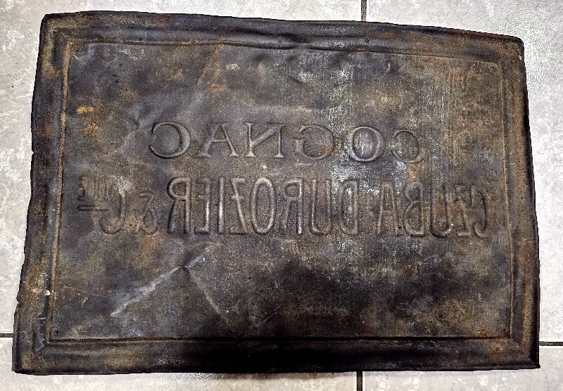 An der Rückseite stellenweise sehr leichrer Oberflächenrost – somit auch leicht zu entfernen oder man belässt es da es auf der Rückseite ist bzw. es sich tatsächlich nur um leichten Oberflächenrost handelt. Keine Löcher in Blechschild. Das Schild ist weitgehend noch ungereinigt und somit im Zustand her noch durch Reinigung um vieles zu verschönern; tolles dekoratives Gesamtmaß von rund 33 x 48 cm; sehr seltene frühes Cognac Blechschild aus der Zeit um 1900 bis 1920