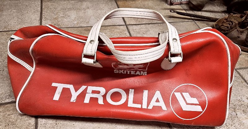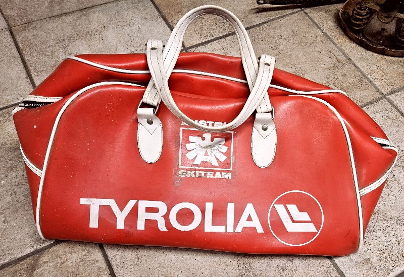 extrem seltene Sporttasche des Tyrolia Skiteams; Wurde in den 70er Jahren nur an die Mitglieder des Skiteams (der Ski Fahrer selber, Betreuer, Agenten, Sportarzt,….) ausgegeben; Wenn man so eine Tasche überhaupt wo auffindet sind diese meistens stärker gebraucht oder gar beschädigt; oftmals ist auch das Material über die Jahrzehnte hart geworden;