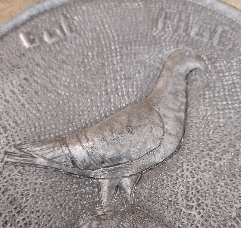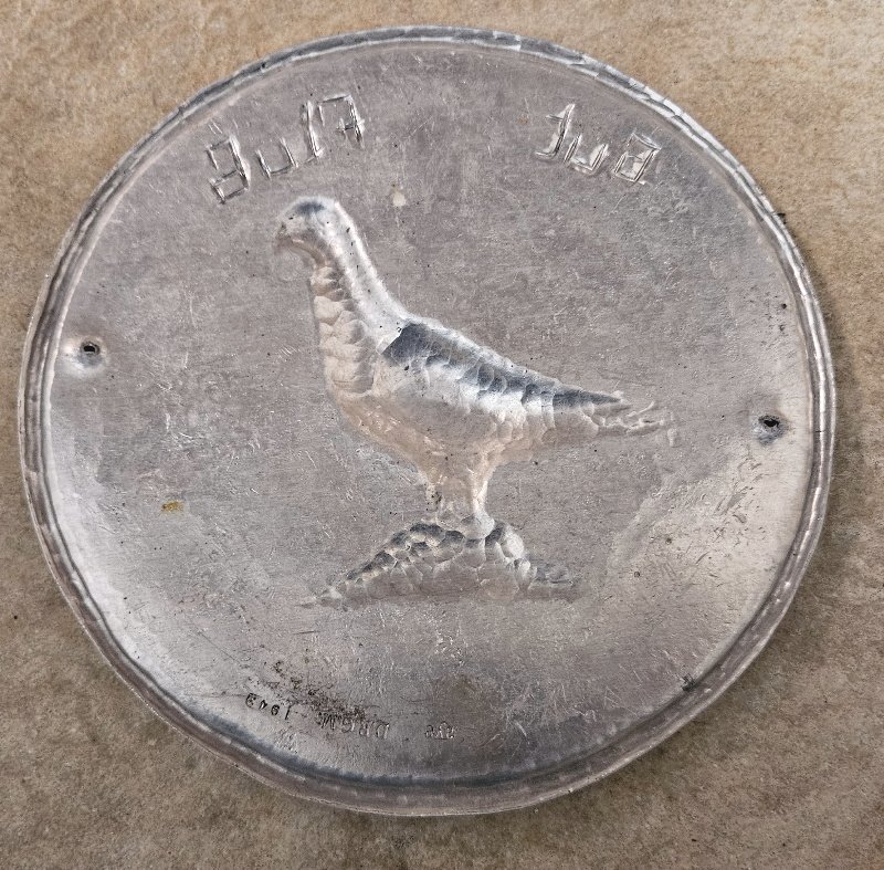 extrem seltene Auszeichnung da es bereits im WK2 keine Massen an Taubenzüchter gegeben hat. Und hier handelt es sich konkret um die Auszeichnung in Silber, gefertigt aus Alu, für verdiente Taubenzüchter sowie für besondere Leistung in der Taubendressur (Weitflug, Orientierungsflug,…). Diese Auszeichnung hat es auch noch in Bronze (bronzierter Zinnguss) und in Gold (poliertes Messing) gegeben.