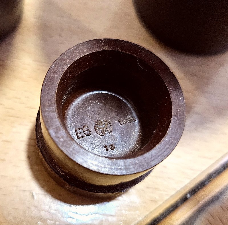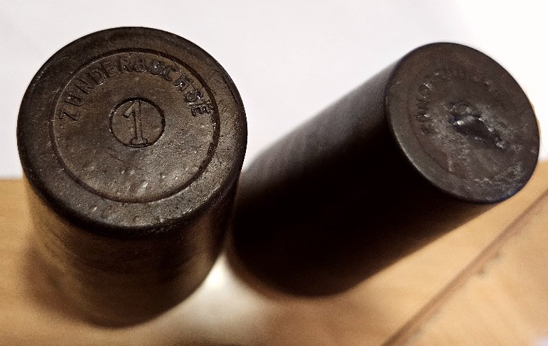 2 gut erhaltene Zünderbüchsen – beide beschriftet und beide Zünderbüchsen in einem guten Zustand; bei beiden Zünderbüchsen ist auch noch der Einsatz (Abstandshalter aus Bakelit) enthalten; Gewinde sind noch leichtgängig, keine Sprünge und keine Risse – beide somit im guten Gesamtzustand.