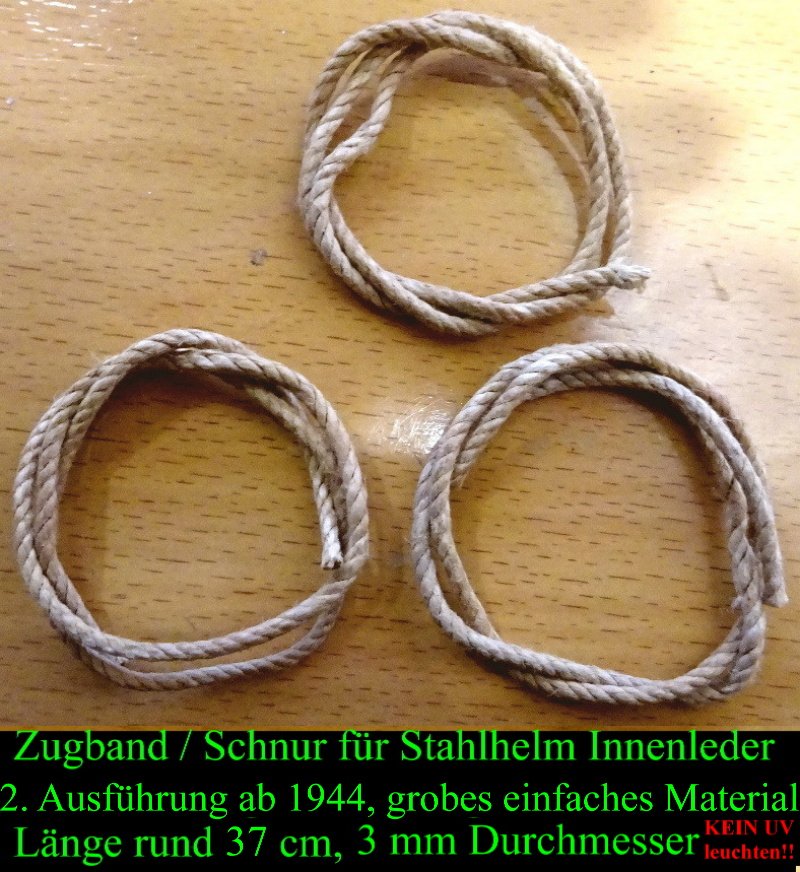seltenes Ersatzteil für Stahlhelme das heutzutage nicht mehr so einfach zu bekommen ist. Konkret hönnen sie hier ein 3er Set an Zugbändern für das Innenleder von WK2 Stahlhelmen ergattern; konkret in der 2. Ausführungsvariante die erst 1943 / 1944 zur Ausgabe gelangte und aufgrund der allgemeinen Materialknappheit doch eher in einer Sparausführung gefertigt wurde. So sind die Zugbänder hier schon etwas dünner ausgeführt und eher in einem einfacheren derben Material gefertigt; dieses 3er Set stammt aus einem unbenutzten und unberührten Lagerbestand und so sind alle 3 Zugriemen in einem top schönen und fast neuwertigen Gesamtzustand